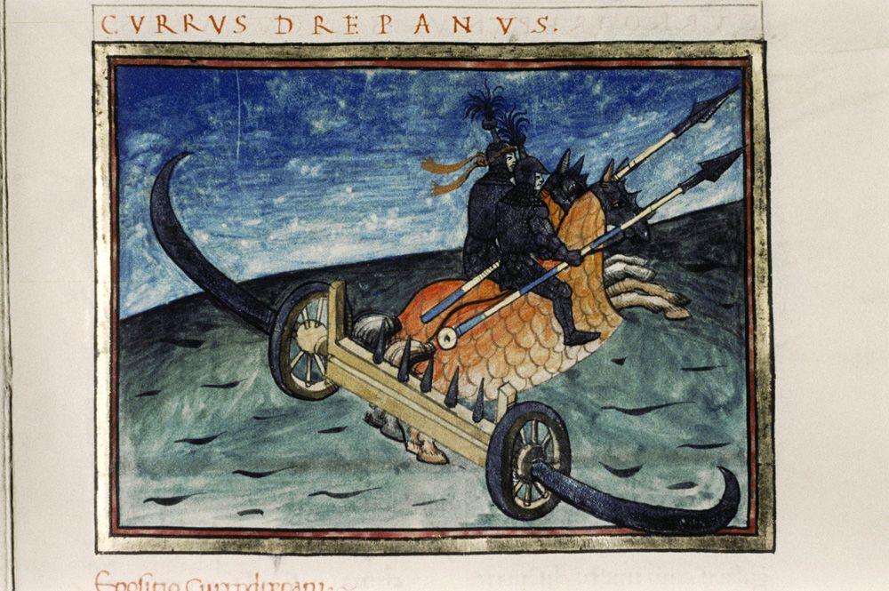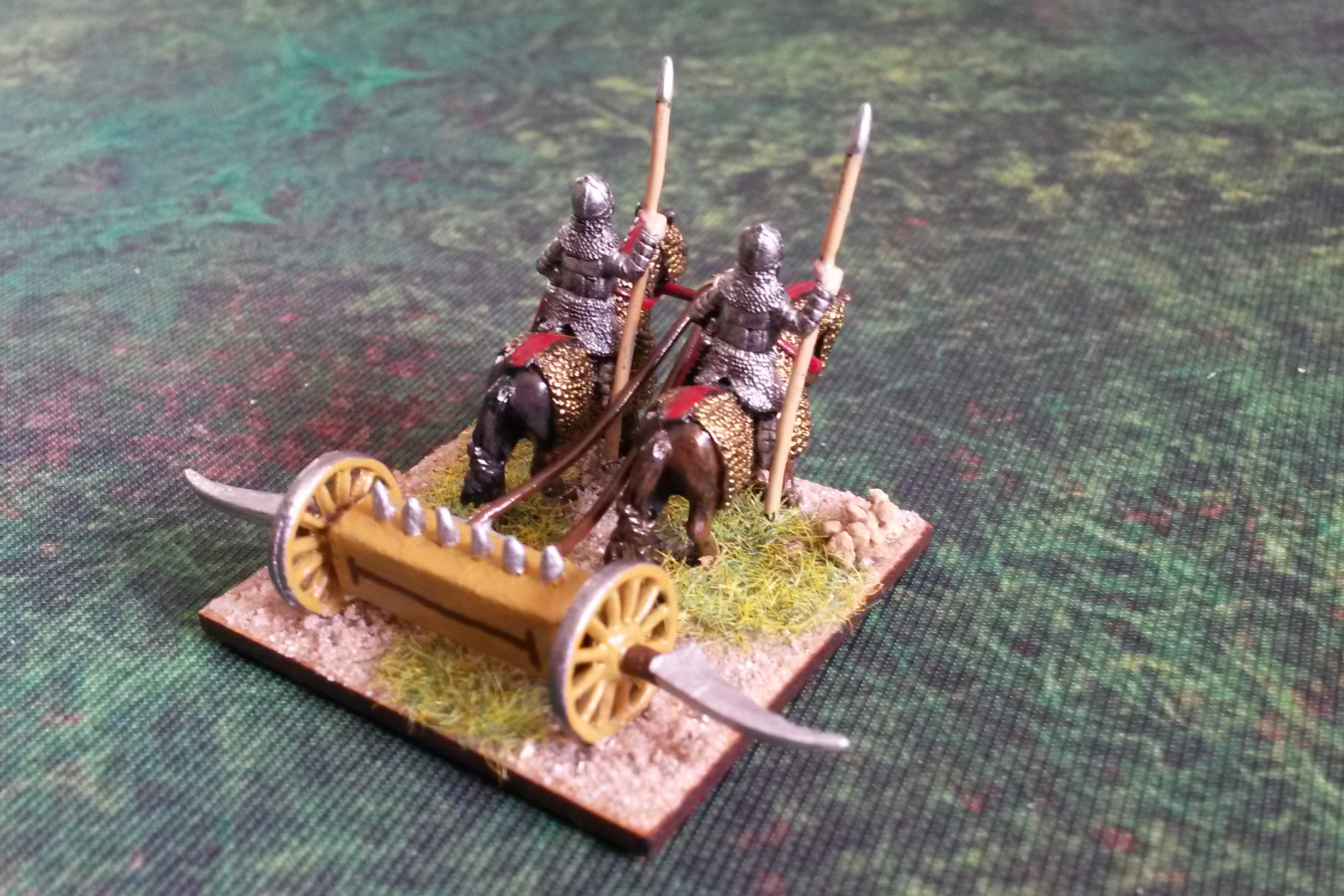 In der DBMM-Liste für die "Late Imperial Romans" gibt es entsprechend die Möglichkeit, einen einzigen (!) von diesen Streitwagen aufzustellen, einen sog. Currus drepanus. Diese Streitwagen sahen etwas anders aus als die klassischen, sie erinnern eher an einen Pflug und hatten keine Kabine. So ein Teil gibt es in 15mm von keinem (mir bekannten) Hersteller, deshalb habe ich es selbst gebaut. Die Pferde und Räder sind von Essex, der Balken ist ein gekürzter Stab von einer Silvesterrakete, die Sicheln sind Sensenklingen von 28mm-Figuren: