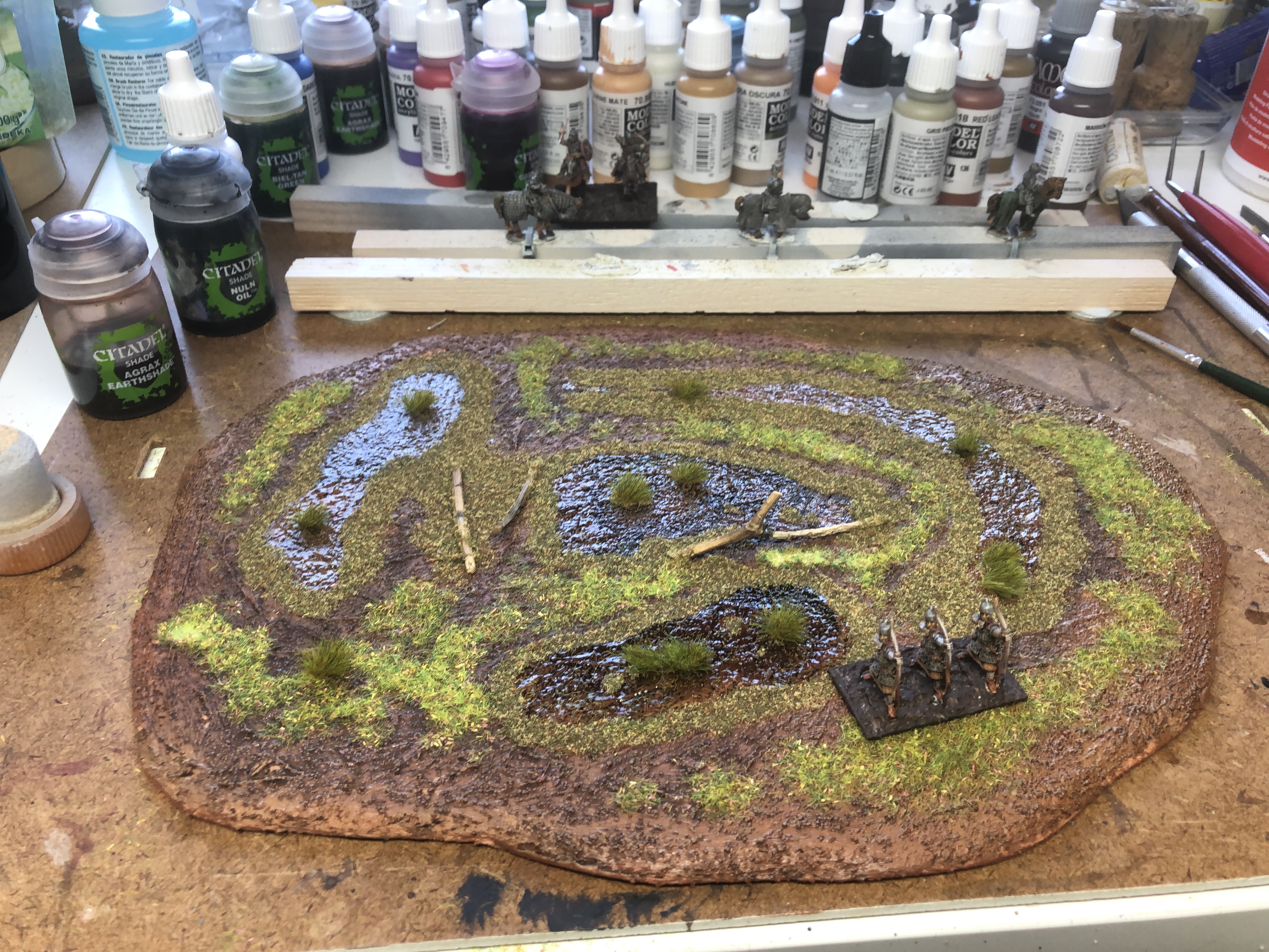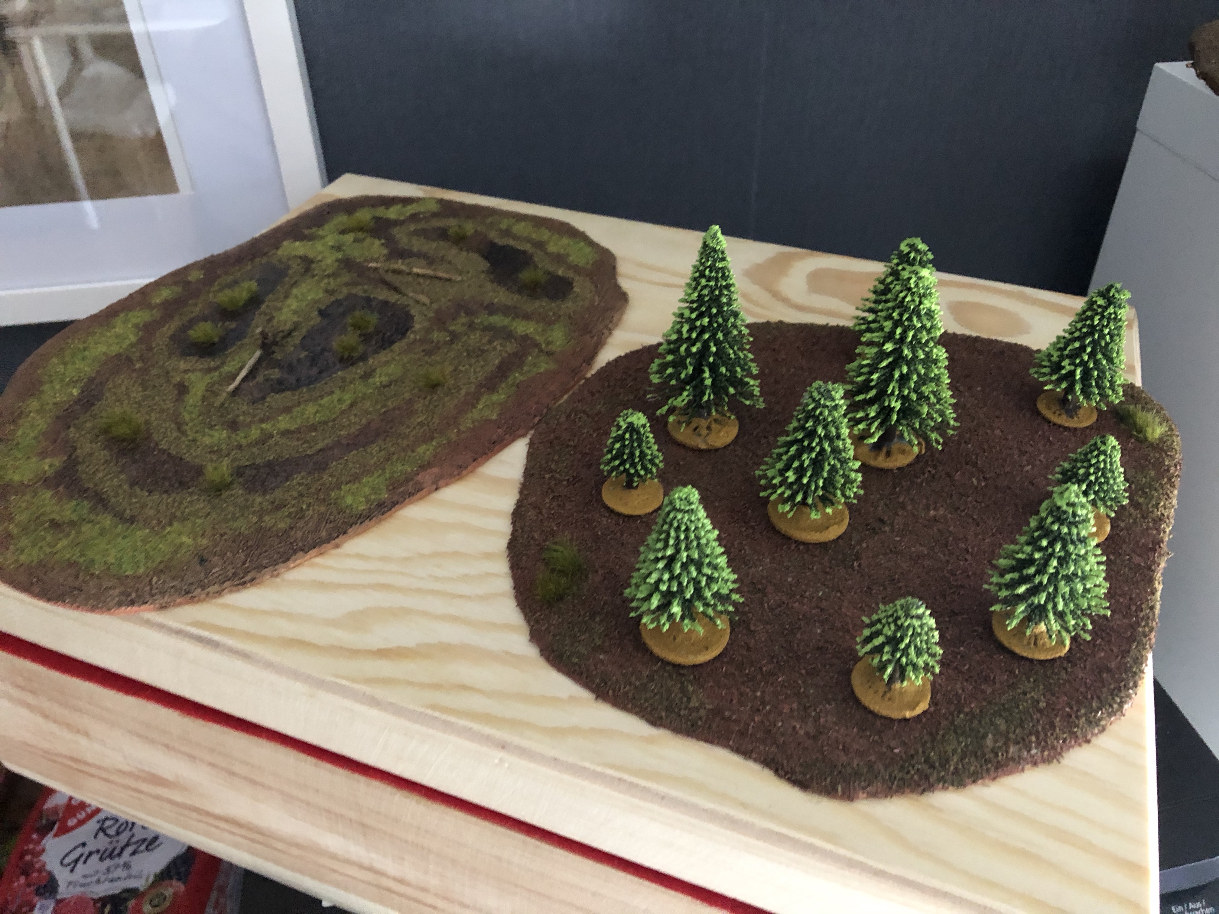 Danke dörr Hör - es ist ziemlich schnell hingeschlotzt: ein Brettchen Sperrholz, dass sich zum Glück unter der Strukturpaste (großflächig mit Pinsel aufgetragen) gar nicht groß verzogen hat, Rückseite mit Mod Podge (best stuff ever) versiegelt, braune und beige Grundierung drauf, bissl Vallejo Water Effekt für den Wasser Effekt und dann ordinäres Grassstreu......die "Bäume" gibts bei mir im Wald um die Ecke...ein paar Tufts verbessern dann immer den hoffentlich guten Eindruck