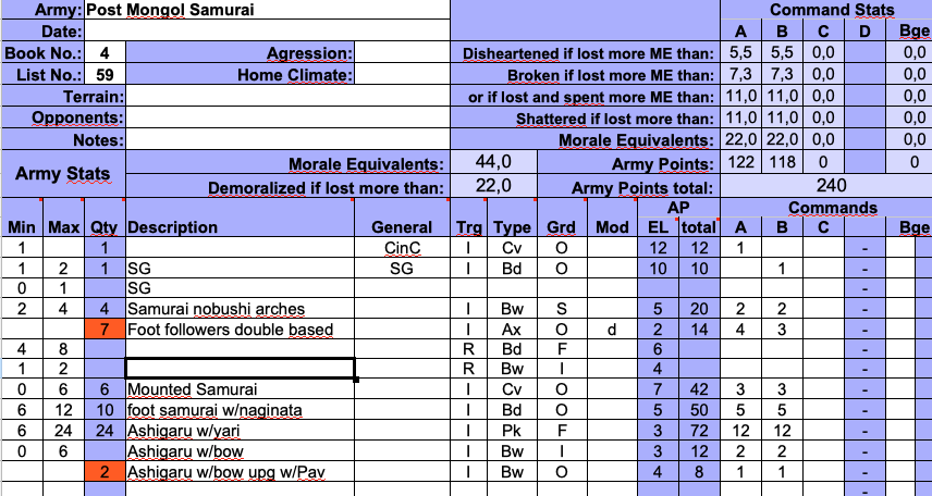 1. ein Allied General - der ist noch schwerer zu handhaben als ein regulärer SG und im schlimmsten Fall wird er sogar abtrünig. Das Sohei Treffen wird auch nicht sonderlich zäh, da Du gar nicht so viele Truppen lt. Liste (bei 240 halbe Anzahl) mitnehmen kannst. Bd F sind zudem, nunja - hauptsächlich schnell und ,schlimmer, impetuous, die rennen dann gerne mal alleine los, die zwei Sohei Bögen werden im Zweifel nicht viel ausrichten (Abschweif: ich bleib dabei: Beschuss ist in DBMM völlig unterbelichtet, wenn man nicht Massen davon dabei hat; zudem gilt anscheinend der rear support Faktor bei den Zielen, was m.E. völlig hinrissig ist, da dichte Infanteriehaufen ja eher anfällig für Beschuss sind)