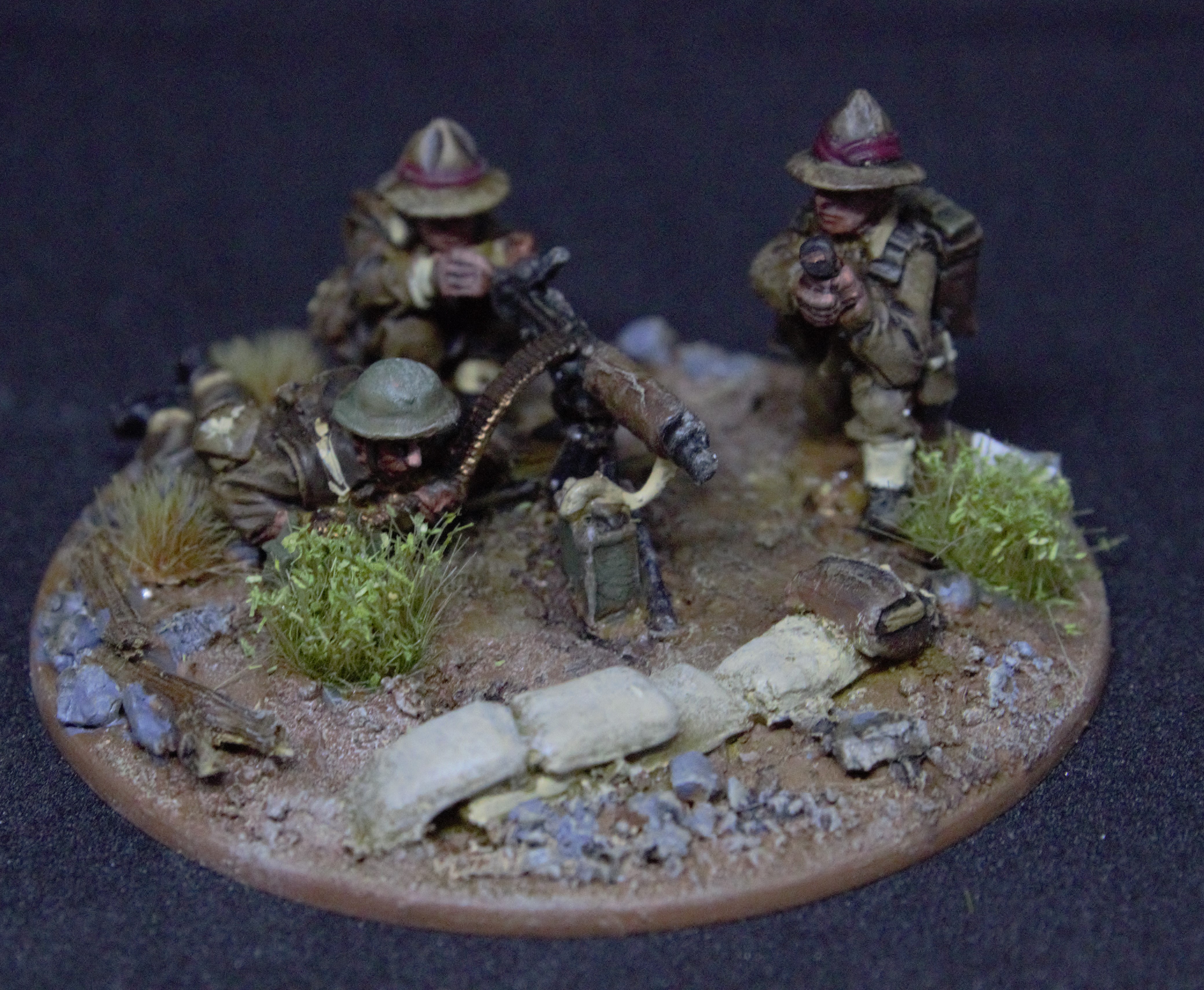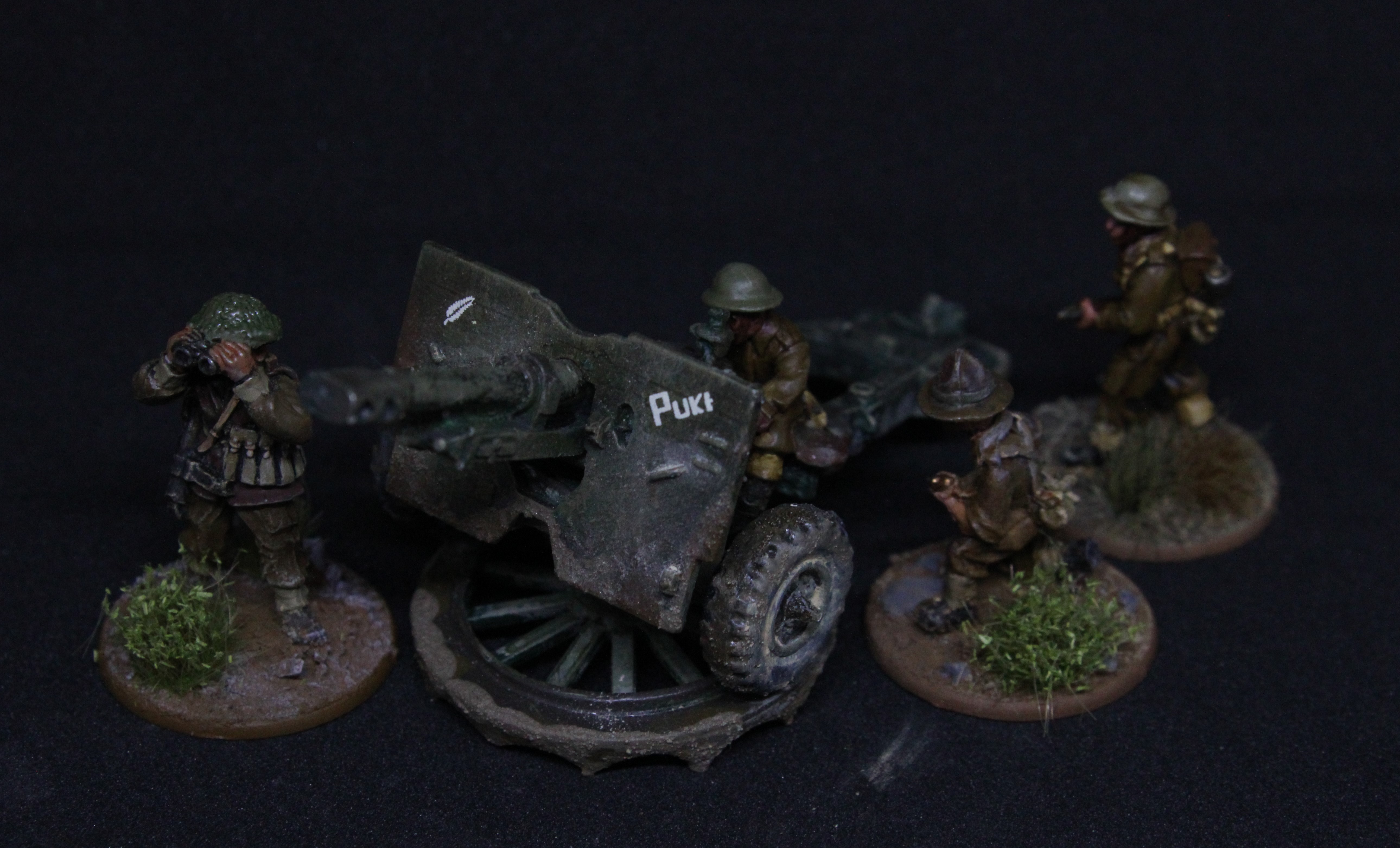 Zusätzlich hatten die Neuseeländer, wie die Australier oder die Schotten auch, eine eigene charakteristische Kopfbedeckung: den "lemon squeezer hat", weil dieser aussieht wie eine Zitronenpresse. Der Hut wurde eigentlich nur mit dem Dienstanzug getragen, allerdings häufig auch in Kampfpausen oder bei Routinearbeiten wie dem Ausheben von Stellungen. Auch wenn mein innerer Knöpfezähler hier rebelliert hat, wollte ich der Armee ein bisschen eigenes Flair geben und habe daher ein paar Modelle mit solchen Hüten untergemischt. Das Battledress (BD) wurde mit Uniformteilen der KD-Serie (khaki drill) gemischt, amerikanische Pullover oder Shirts sowie deutsche Stiefel waren hochbegehrt. Daher auch eine Farbgebung in Sand/Khaki zusätzlich zum Braun des BD. Bezüglich der sonstigen Uniformteile wurde gemäß meiner Recherche insgesamt kein großer Wert auf die Einhaltung regulatorischer Vorgaben gelegt, was größtenteils auch auf die 8th Army bzw. Gen. Montgomery zurückzuführen war. Letzterer hatte ja in seiner Dienstzeit nur eine einzige Order zum Thema Bekleidung gegeben: "Top hats will not be worn in 8th Army", nachdem ihm auf einer Fahrt ein fröhlich winkender, nackter Corporal zugewunken hatte, der auf seinem Kopf einen Zylinder getragen hatte.