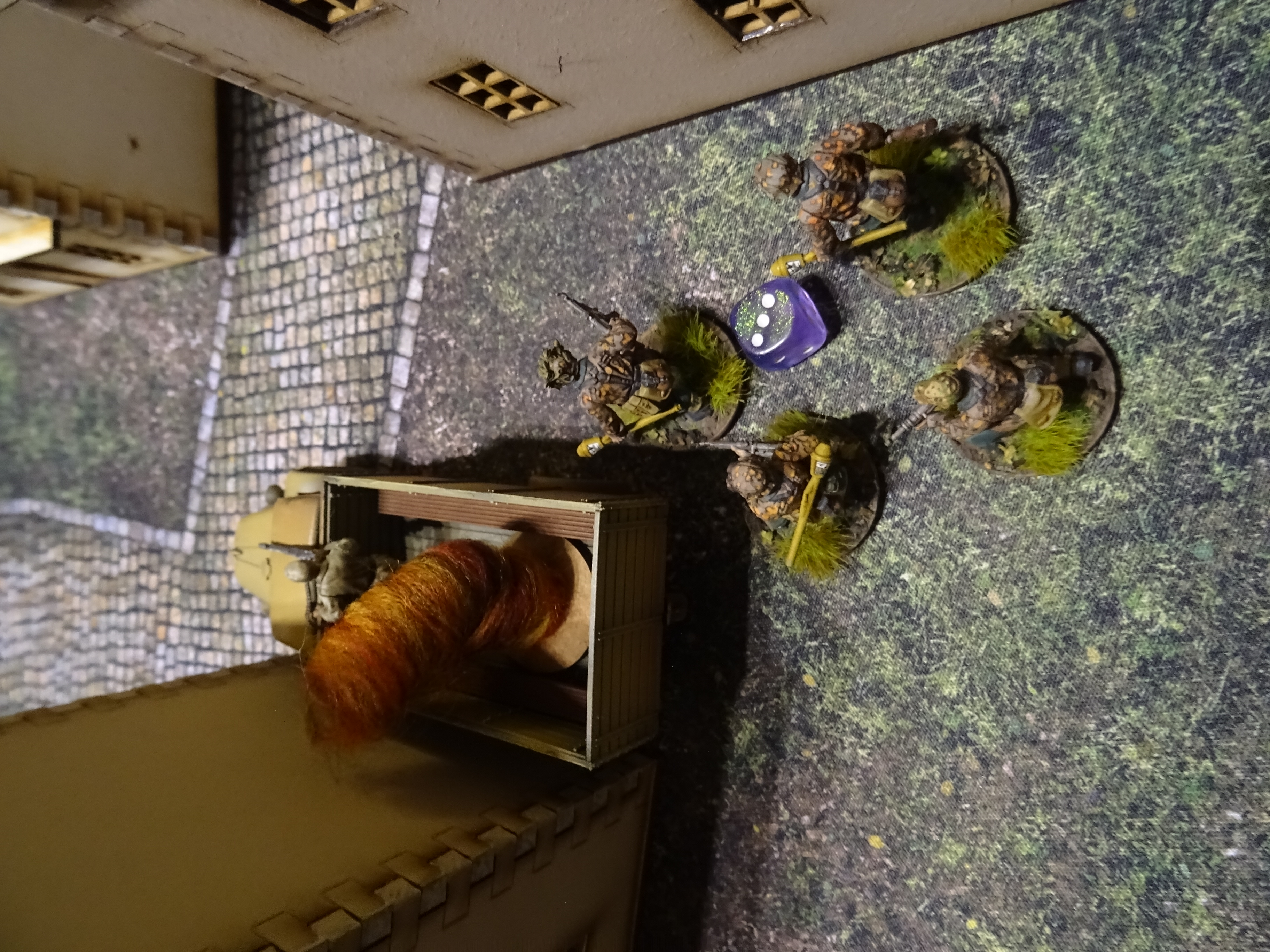 Trotzdem muss das die Besatzung so irritiert haben, dass sie Ihre Befehle verweigert und zurücksetzt. Genau für den Firefly, der nun ungehindertes Schussfeld hat und mit einem Traumschuss (sechs als Treffer gefolgt sechs für den Schaden und damit außerordentlichen Schaden (auch hier zwei Sechen auf der Tabelle) den Panzer IV gefühlt bis zum Mond sprengt. Der gerade eintreffende Opel Blitz scheint geschockt, da ereilt es auch schon ihn. Ein MMG Schuss aus dem Bren Gun Carrier trifft wahrscheinlich den Tank. Das Fahrzeug brennt und die Besatzung macht sich schnell aus dem Staub bevor das Fahrzeug explodiert. Der aufsitzende XX Trupp reagiert nicht so schnell und 4 von 8 Mann erwischt es, als der Truck in die Luft fliegt. Von der Kette der Ereignisse traumatisiert hält es auch die restlichen Veteranen nicht mehr auf dem Spielfeld.