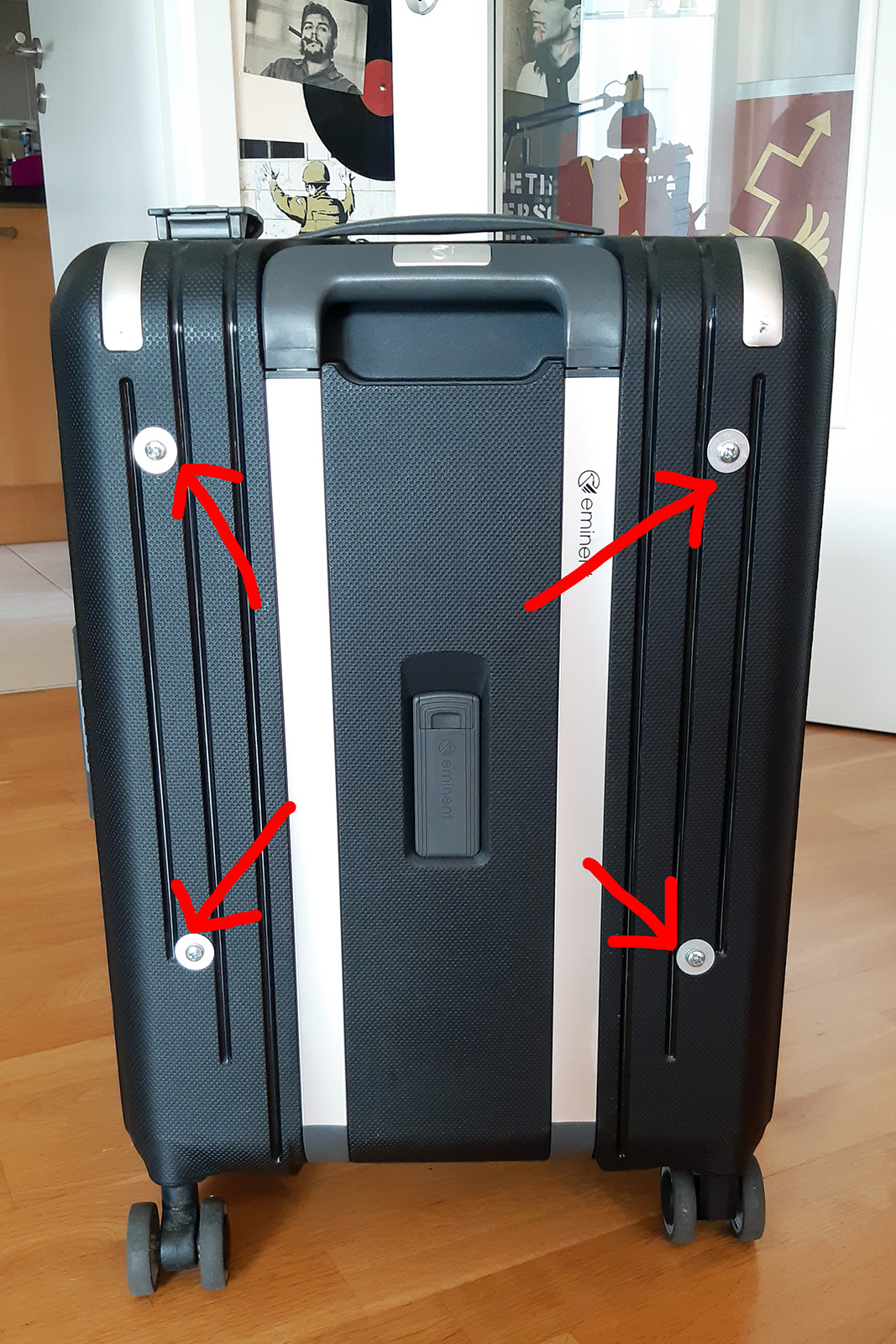 3) Ich habe dann mit der Bohrmaschine vier Löcher in die Hartschale gebohrt und darin Schrauben (inkl. Scheiben und Muttern) befestigt. Bei www.bleche-nach-mass.de habe ich eine passende Metallplatte mit vorgebohrten Löchern anfertigen lassen, die mit Flügelmuttern auf den Schrauben befestigt und leicht auch wieder abgenommen werden kann. Auf diese Metallplatte setze ich meine Basen, die, wie oben gesagt, alle mit Neodym-Magnetfolie beklebt sind und somit superfest darauf halten :D D.h. ich kann den Koffer normal hinter mir herziehen, die magnetische Bindekraft ist so stark, dass die Armee nicht verrutscht und auch nix abfällt. Lediglich über Kopfsteinpflaster oder hohe Kanten würde ich den Koffer nicht ziehen, da dann ggf. kleinere Mengen Basenstreu etc. abgeschüttelt werden könnten...