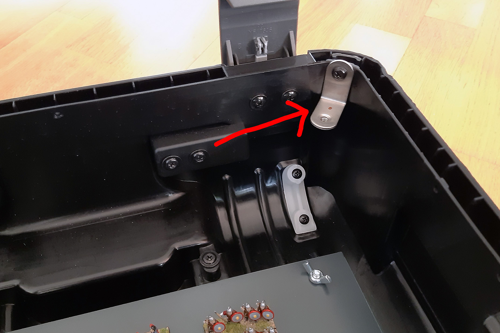 4) In vier der Schraubenlöcher, in denen das Innenfutter befestigt war, habe ich L-Winkel montiert. Darauf kann ich eine passend zugesägte Acrylglasscheibe mit Flügelschrauben befestigen und auch leicht wieder entfernen. Auf dieser Scheibe können z.B. die Anleitung, Armeebücher oder Zettel etc. verstaut werden, außerdem sind die Figuren darunter noch besser geschützt - und das ganze sieht edler aus (aber diese Scheibe ist quasi die Luxusvariante und muss natürlich nicht unbedingt sein).