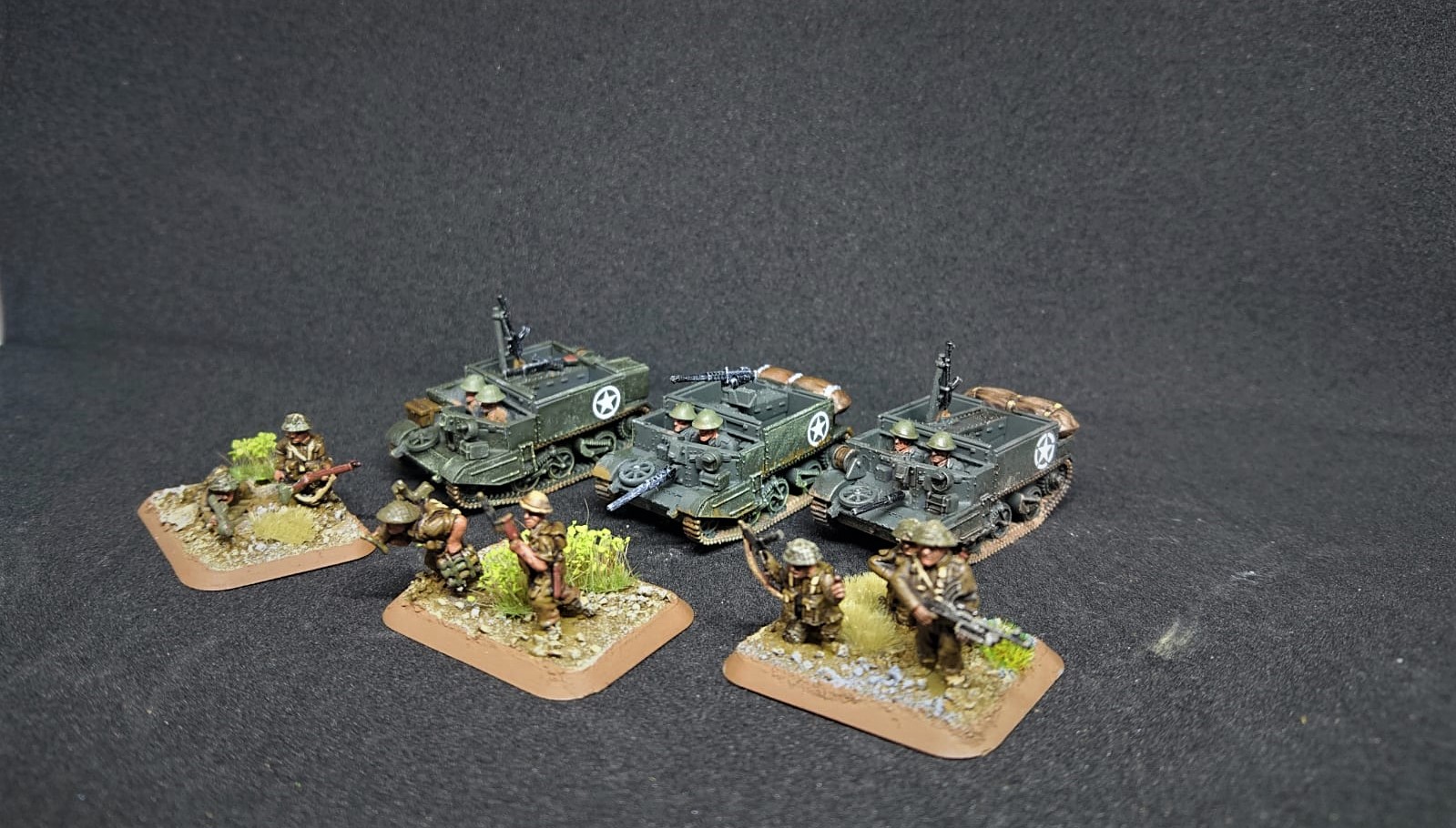 Hier mal ein Überblick über die gesamte Armee, wie sie bisher fertig gestellt wurde. Man sieht vorrangig zwei Züge Infanterie mit Support und ein Sherman-Panzerzug. Dazu einige Support-Auswahlen.
