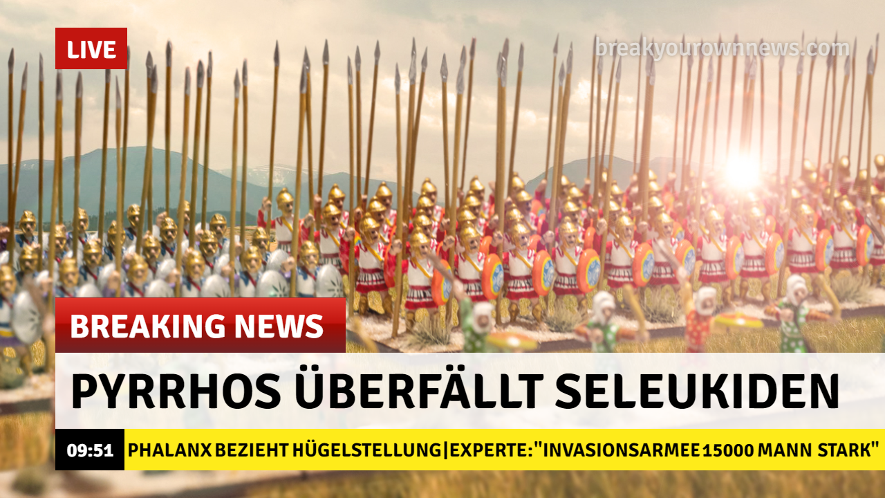 Am 3. Juli diesen Jahres hatte Pyrrhos, König von Epirus, Abkömmling des Achilleus, verwandt mit Alexander dem Großen, eine folgenschwere Entscheidung zu treffen: Sollte er mit seiner 400 AP starken Invasionsarmee nach Westen oder nach Osten aufbrechen? Da im Westen, in Italien, vermutlich nur Pyrrhossiege auf ihn warten würden, entschied er sich, gen Osten aufzubrechen und in das ebenso mächtige wie große Seleukidenreich einzufallen. Als Reminiszenz an Italien führte er aber eine gehörige Anzahl italischer Söldnertruppen mit (Osker, Tarentiner, italische Hopliten). Es war an einem schönen Sommermorgen, als König Seleukos sich ihm mit seiner Armee entgegenstellte und eine aufregende und streckenweise ergebnisoffene Schlacht entbrannte.