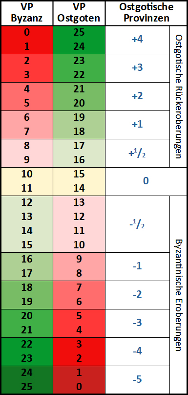 Hinweis: Die Tabelle ist "unausgeglichen", da die Byzantiner bei gegebener Höhe der VP stets mehr Provinzen erobern können, als die Ostgoten bei gleicher Höhe zurückerobern könnten, und die Byzantiner sogar bei unentschiedenen Schlachten in der Lage sind, Provinzen partiell zu erobern. Dies liegt darin begründet, dass den Ostgoten zu Beginn der Kampagne ja bereits alle Provinzen gehören, wodurch die Byzantiner unterlegene Startbedingungen haben. (Die "historische" Erklärung könnte man darin finden, dass allein die Präsenz einer byzantinischen Armee auf ostgotischem Reichsboden die Herrschaft der Goten unterminiert und ihre Gewalt über die italische Bevölkerung reduziert wird.)