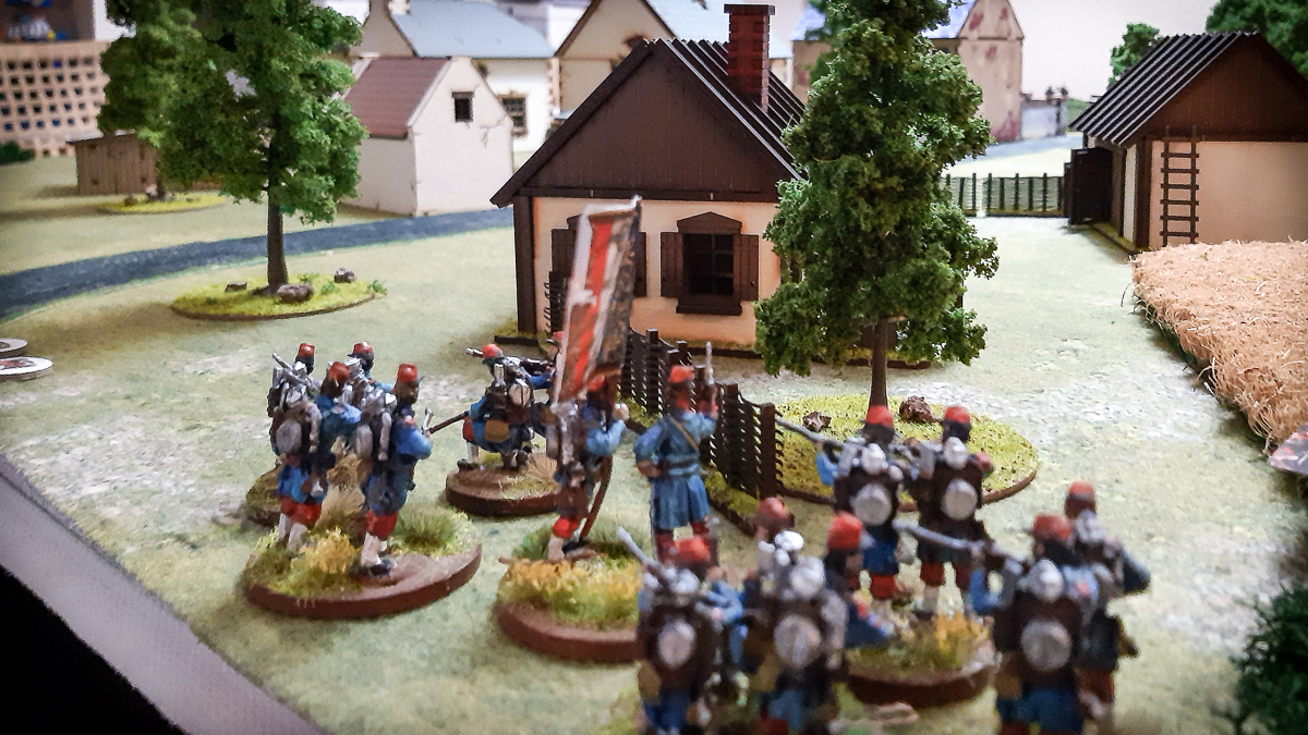 Hier stehen sie noch dicht vor dem Gebäude, während die Franzosen hinten langsam, aber stetig anrücken.