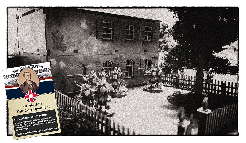 ... zum Schluss stürmen die Franzosen das immer noch von den Preußen besetzte Gebäude, leider für sie ohne Erfolg. Die Franzosen haben eine spezielle Fähigkeit freigeschaltet und einen britischen Kriegsreporter "embedded", so dass diese letzte Phase des Gefechts auch auf einer zeitgenössischen Fotografie für die Nachwelt festgehalten wurde (die Franzosen mussten wegen der damals langen Belichtungszeit still stehen, vielleicht hat sie das den Sieg gekostet...? ;) ).
