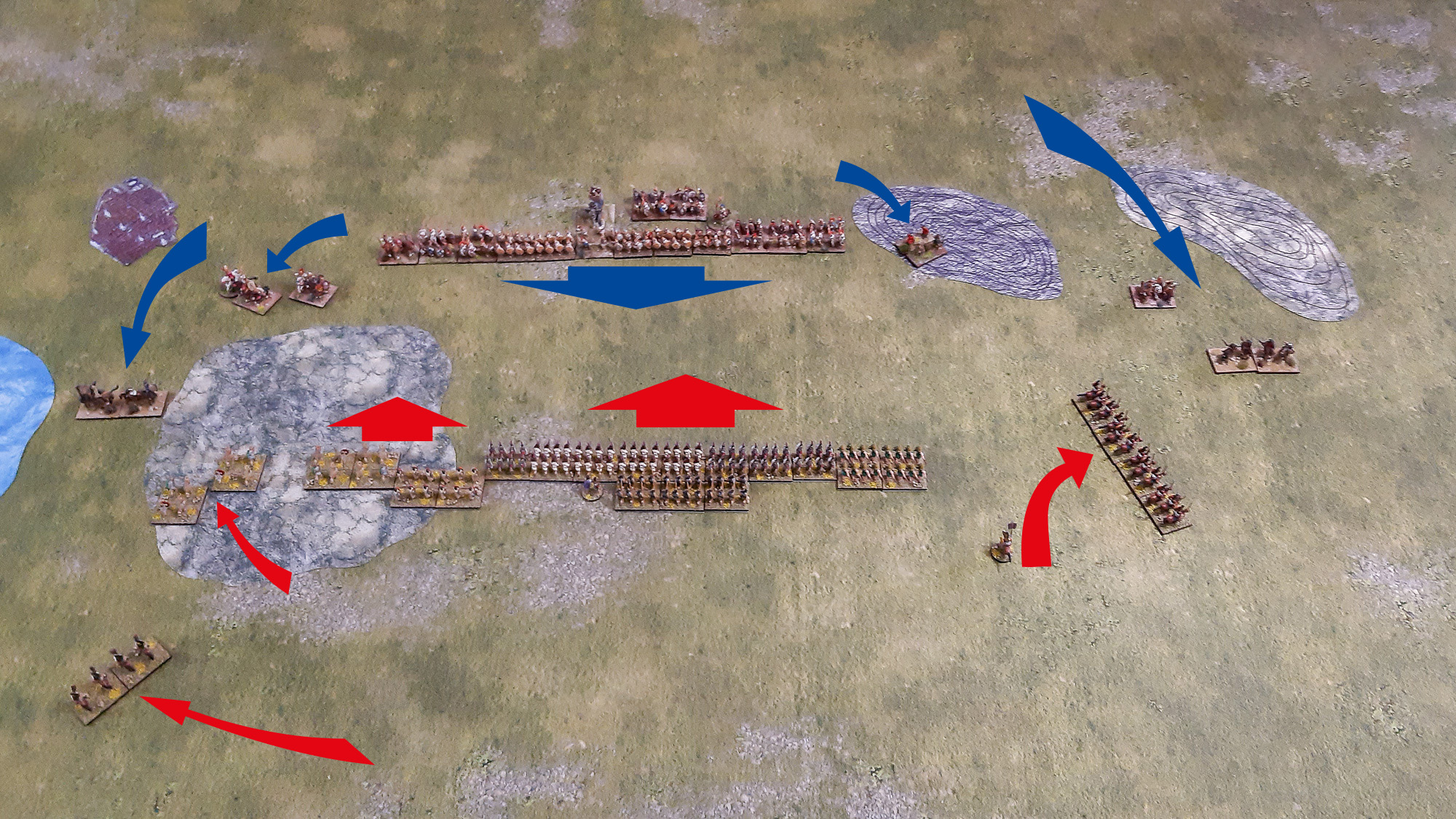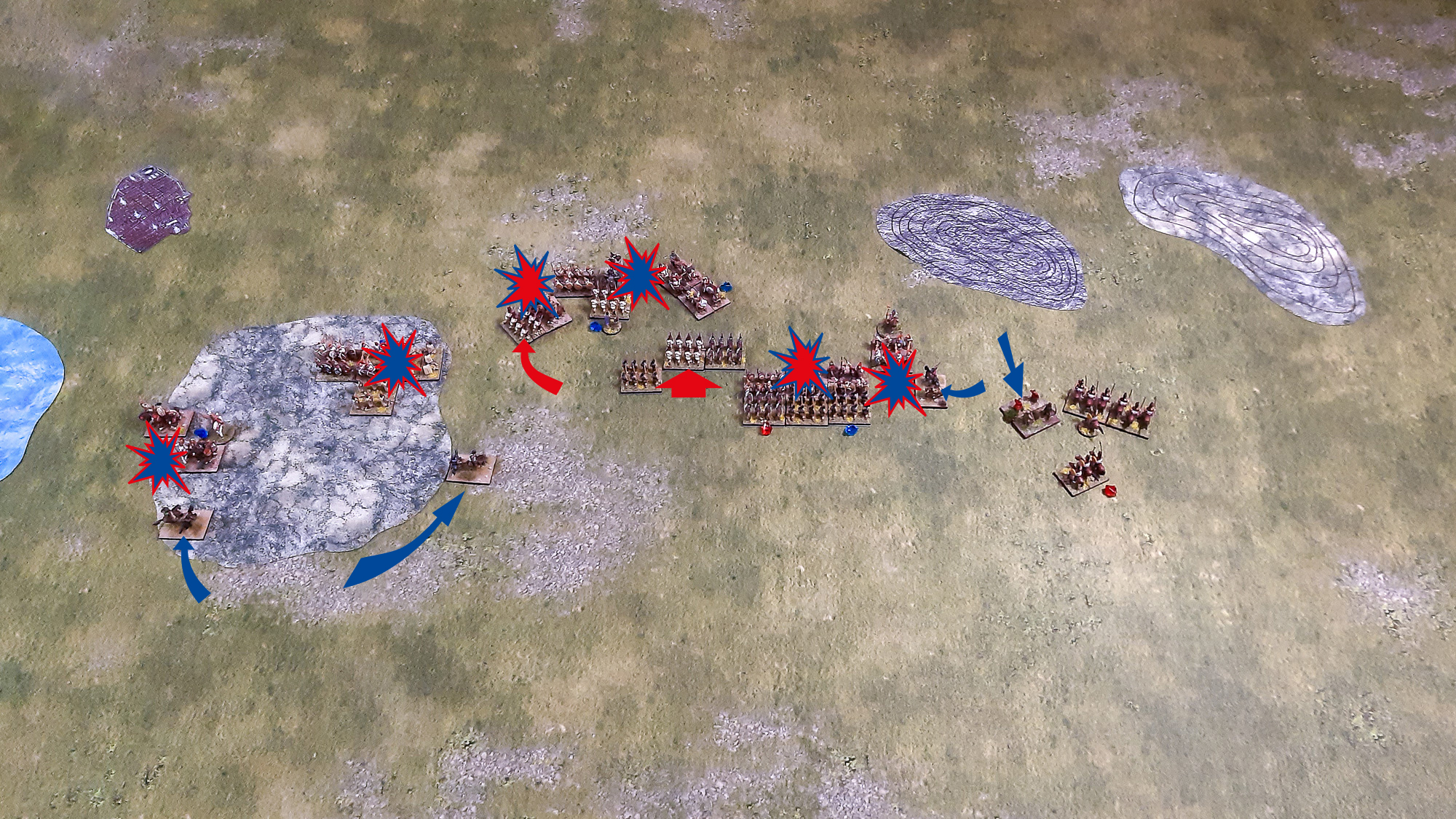 Ein Numidischer Reiterverband der Karthager umritt schließlich das unebene Gelände und suchte nach einem Ziel im Rücken der römischen Armee, während ein anderer Verband zusammen mit den Keltiberischen Reitern die römischen Velites im Gelände konzertiert attackierte. Diese wehrten sich tapfer, mussten sich aber der Übermacht beugen. Auch am anderen Ende des unebenen Geländes wurden die Velites von den Spanischen Scutarii der Karthager geschlagen, während die Latinische Infanterie der Römer tapfer weiterkämpfte. Zumindest ist es ihnen bis hierhin gelungen, die linke Flanke der römischen Hauptinfanterielinie zu beschützen. Auf der rechten Seite konnten sich die römischen Equites gegen ihre karthagischen berittenen Widersacher durchsetzen, sahen sich aber dem fortdauerndem Beschuss durch die Balearischen Schleuderer ausgesetzt, die schließlich doch noch eine Einheit Equites ausschalten konnten - ein empfindlicher Verlust.