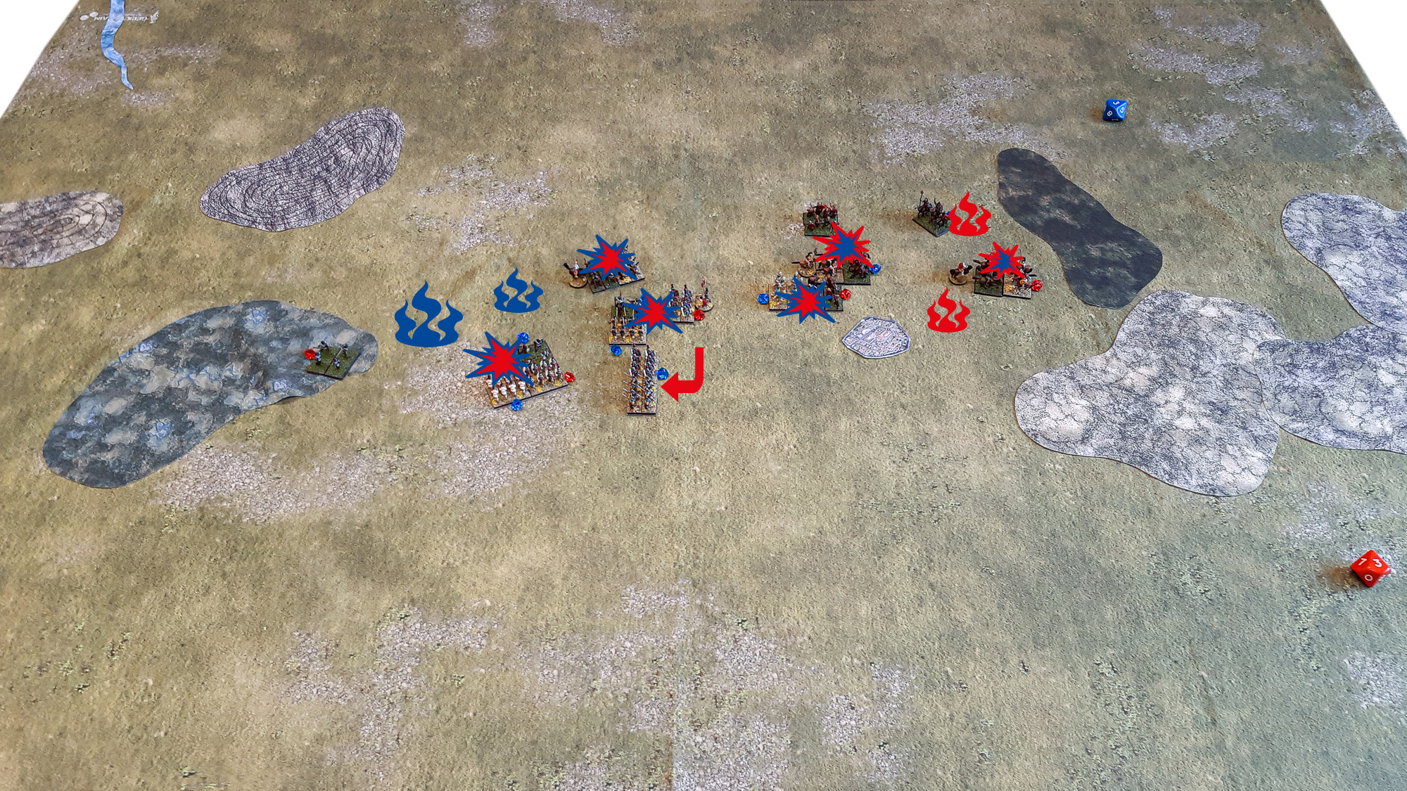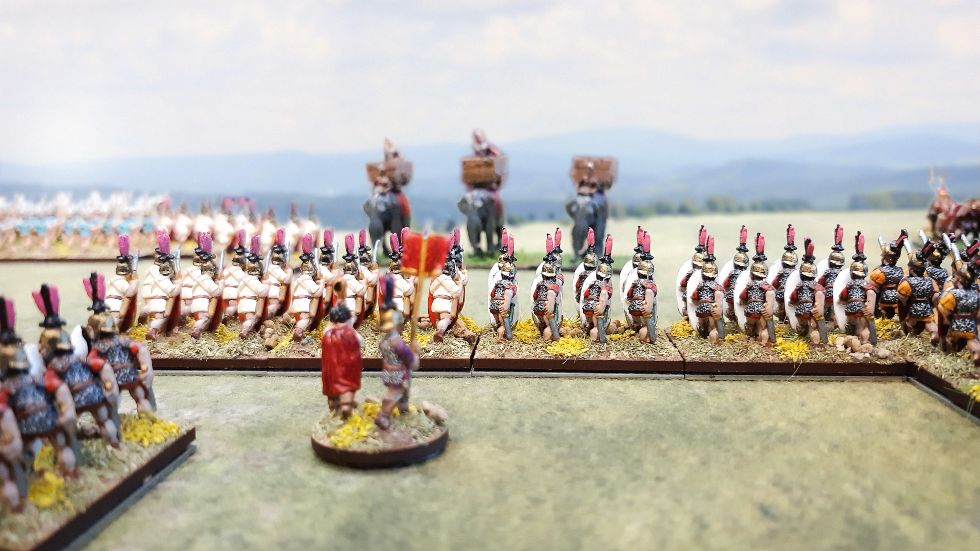 Die römischen Velites stellten sich den Balearischen Schleuderern und der Numidischen Reiterei, konnten letztere sogar in ungünstiger Kolonne abfangen, unterlagen aber schrittweise dem gegnerischen Druck. Die Latinische Infanterie des linken römischen Flügels und Teile der Hastati waren ebenfalls weit vorgedrungen und griffen die Lybischen Veteranen an, erlitten aber erste Verluste. Überraschend gelang es einem Hastati-Kontingent, einen karthagischen Elefanten im Frontalangriff nieder zu ringen – ein bemerkenswerter Einzelerfolg! Die übrige Elefantenlinie setzte den Vormarsch unbeirrt fort. Im Zentrum formierte sich die römische Gefechtslinie indes um – Teile der Principes aus der zweiten Reihe schwenkten zur Verstärkung nach rechts aus, um eine Linienverlängerung gegen drohende karthagische Durchbrüche zu realisieren. Auch die Triarier konnten nun in die Linie eingebunden werden, wenngleich nur teilweise, da sie noch in tiefer Marschordnung operierten. Die andere Hälfte der Principes wurde bereits zur bedrohten linken Flanke abkommandiert.