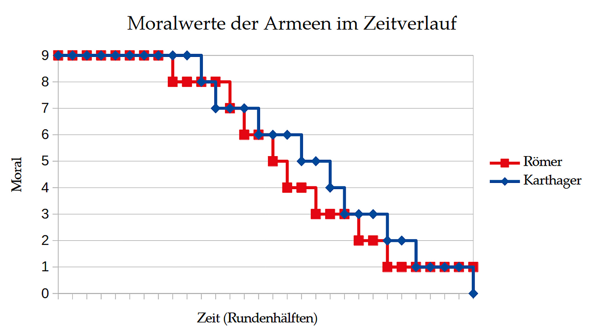 Doch schließlich kippte die Lage zugunsten Roms: Zwar misslang eine Umklammerung gegen einen der karthagischen Generäle, doch die Römer hielten durch und behaupteten das Gefechtsfeld – wenn auch mit minimalem Restmoralwert von 1. Die Moral Karthagos erodierte auf 0, womit dessen Streitmacht zerfiel. Der Ausgang war denkbar knapp; der blutige Verlauf und enorme Aderlass unterstreichen die erbitterte, taktisch anspruchsvolle Auseinandersetzung – die Karthager verloren 73 % ihrer Truppen, die Römer 72 % sowie einen General.