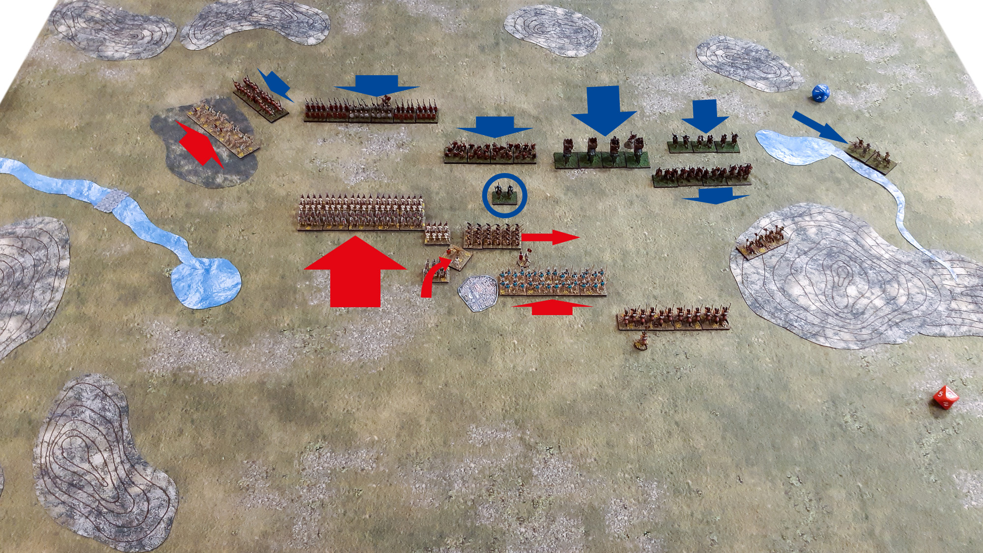 (2) Umgruppierungen und Gegenmaßnahmen. Und tatsächlich, gleich zu Beginn überraschte die karthagische Armeeführung durch eine umfassende, in dieser Konsequenz selten beobachteten taktische Rochade: Die Elefanten schwenkten in Kolonnenformation geschlossen nach rechts ab, während die Ligurier zum Gegenschwenk auf den linken Flügel antraten. Die zentrale Keltiberische Reiterei verlagerte sich in vollem Galopp an die äußerste rechte Flanke bis an den Rand des dortigen Teichs, eskortiert von den Balearischen Schleuderern. Die Mehrheit der Numidischen Reiterei zog ebenfalls nach rechts ab, bis auf einen kleinen Stoßtrupp, der im Zentrum verblieb. Die Spanischen Scutarii marschierten zügig auf das Waldgebiet vor, während einzig die Lybischen Veteranen ihre Richtung stoisch direkt auf den Feind beibehielten, ohne Verlagerung.
