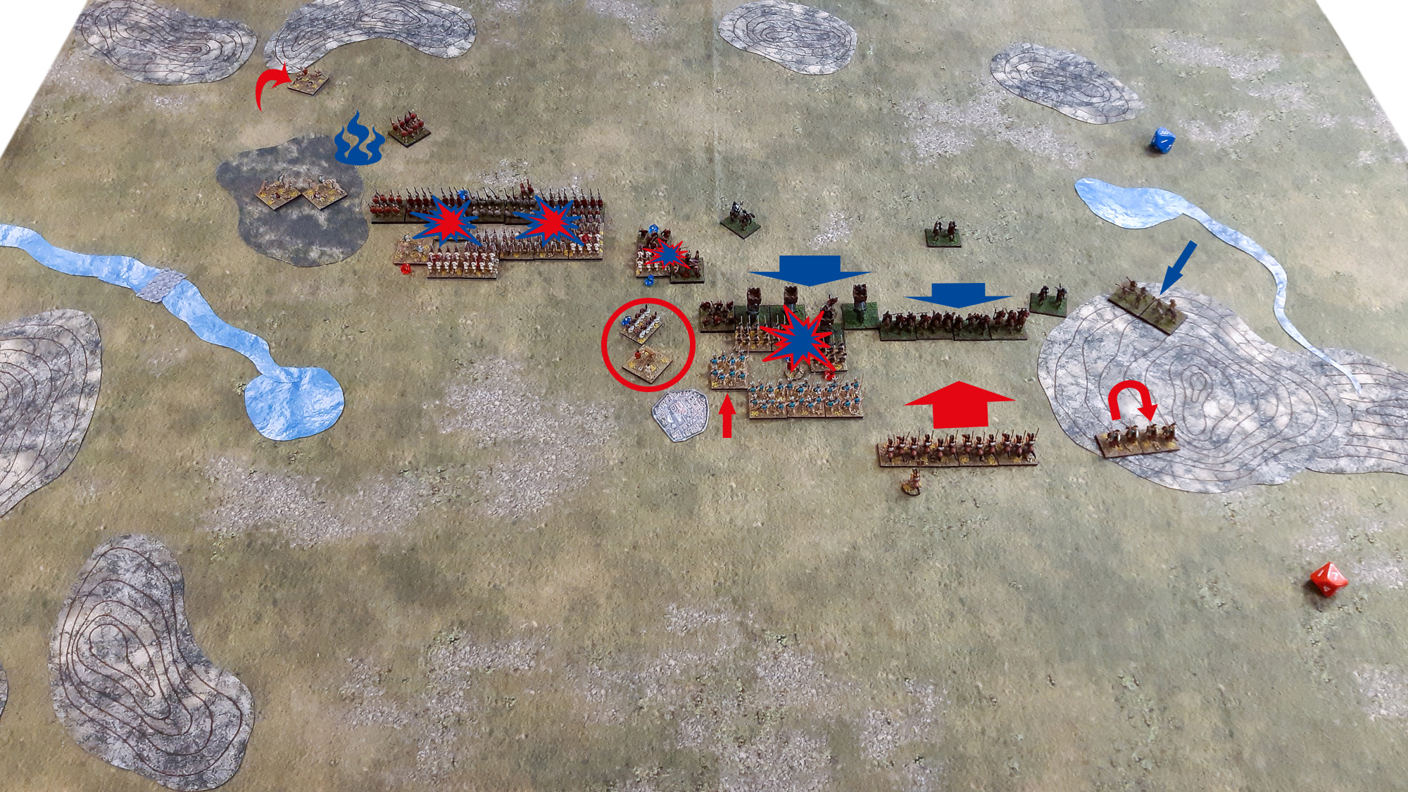 Bemerkenswert war die Lage rund um das Scorpio-Katapult (roter Kreis), gegen welches der detachierte Numidische Reiterverband eine Attacke ritt, der jedoch im Zusammenwirken mit einer Hastati-Abteilung, die noch im rückwärtigen Raum als Nachzügler unterwegs war, zuverlässig abgewehrt werden konnte. Dadurch erhielt das Katapult erstmals ein freies Schussfeld – wenngleich nur für kurze Zeit.