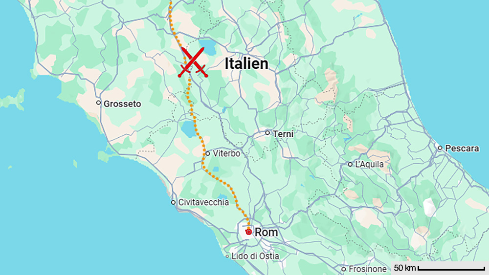 Die topografischen Rahmenbedingungen ermöglichten eine präzise Lokalisierung des Kriegsschauplatzes: Das Gefecht tobte in Umbrien, nahe der Grenze zur Toskana, zwischen Lago di Chiusi und Lago di Montepulciano, mit dem Ort Porto (heutiger Name) inmitten des Einsatzraums. Die Distanz zur Hauptstadt Rom betrug von hier noch ca. 140 Kilometer – für eine unmittelbar drohende Gefahr von "Hannibal ante portas" also (noch) zu weit. Allerdings hätte ein zügiger Vormarsch entlang der Via Cassia* die karthagische Streitmacht in kürzester Zeit bedrohlich nahe an das Herzstück der römischen Republik geführt.