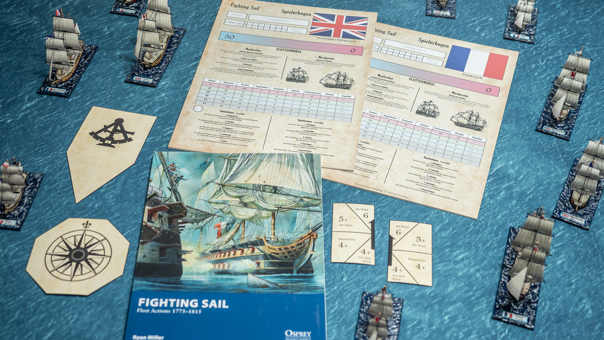 Spielerisch stelle ich mir das Ganze trotz des Aufwands als ein niedrigschwelliges Bier-und-Brezel-Spiel vor - insbesondere, um mit Leuten zu spielen, die nicht aus dem Wargaming-Hobby kommen und eher nicht so auf Figürchen und "Kriegsspiele" stehen, bei majestätisch dahingleitenden Segelschiffen aber schwach werden (und wer tut das nicht?). Deshalb habe ich mich für das einfach zu erlernende und zu spielende Regelwerk Fighting Sail von Osprey entschieden (von dem manche Kritiker freilich meinen, es sei zu unterkomplex, aber was soll's). Schöne Spielerbögen und Schablonen zum Messen habe ich auch entworfen und drucken lassen.