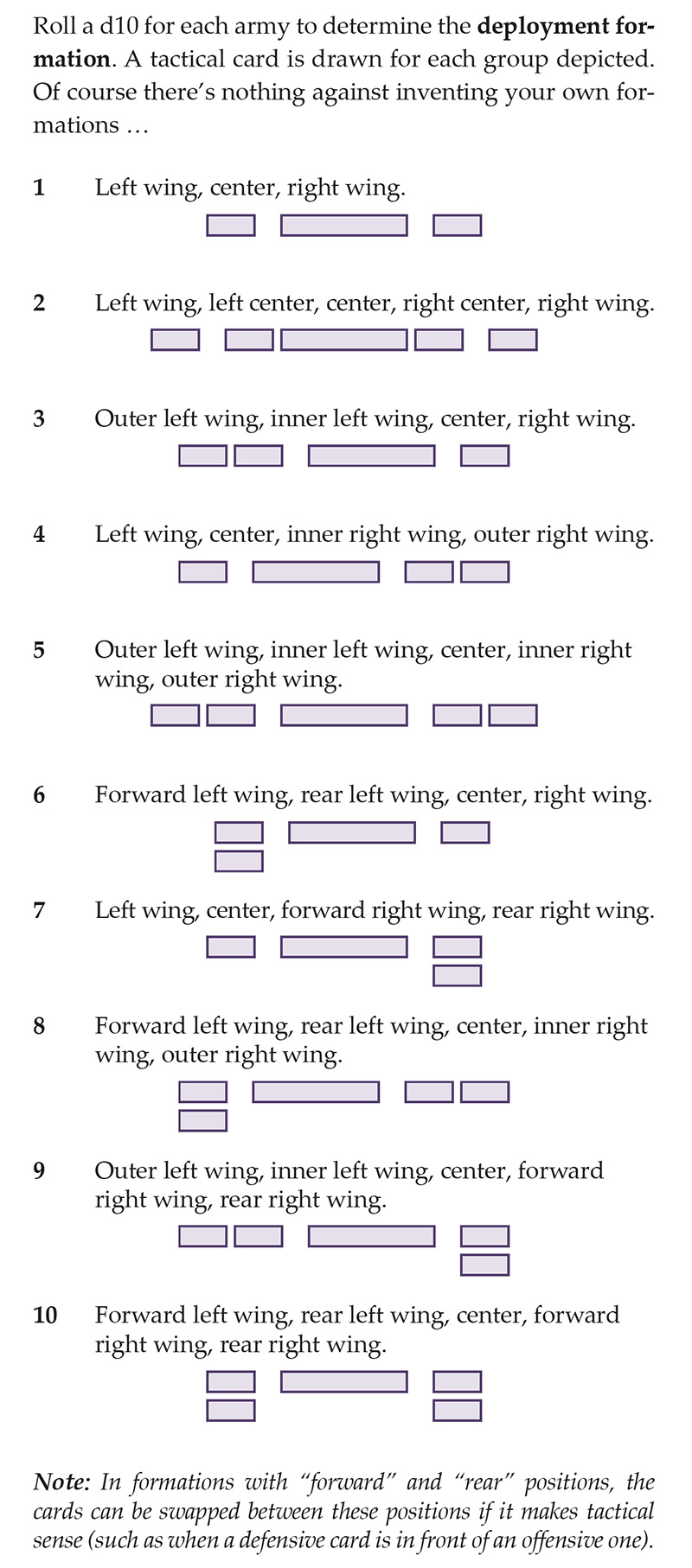Der Wurf für die erste Armee (obere Tischkante) war eine sechs, was in einer Armee mit einem vorderen/hinteren linken Flügel, dem Zentrum sowie einem rechten Flügel resultierte. Der Wurf für die zweite Armee (untere Tischkante) war eine zehn, was eine Armee mit einem vorderen/hinteren linken Flügel, dem Zentrum sowie einem vorderen/hinteren rechten Flügel bedeutete. Die Anzahl taktischer Doktrinkarten wurde entsprechend verdeckt gezogen und angeordnet.