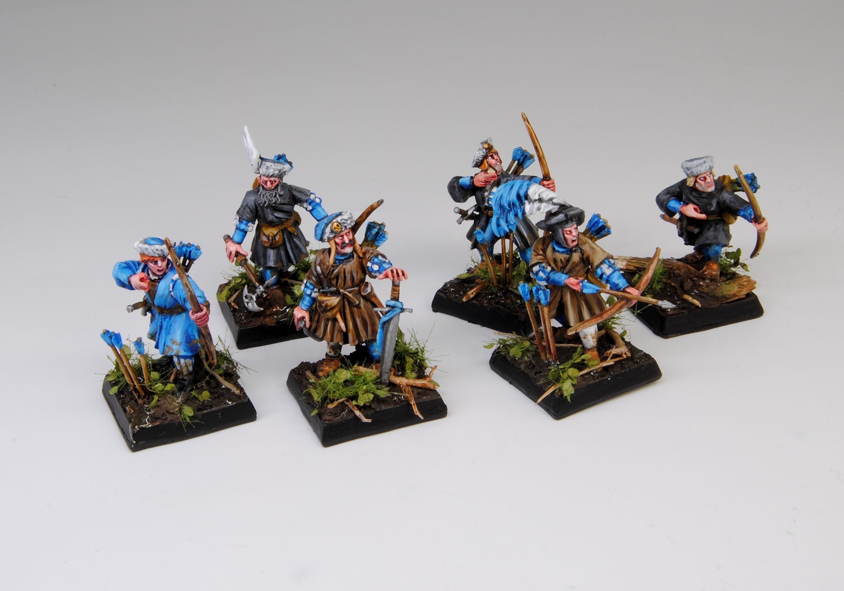 Deshalb habe ich mit einer Einheit Bogenschützen angefangen. Da ich auf eine satte blau-weiße Farbkombination Lust habe, hat es eine Truppe Middenländer Jäger aus dem Drakenwald in die Dienste des Averlandes verschlagen.