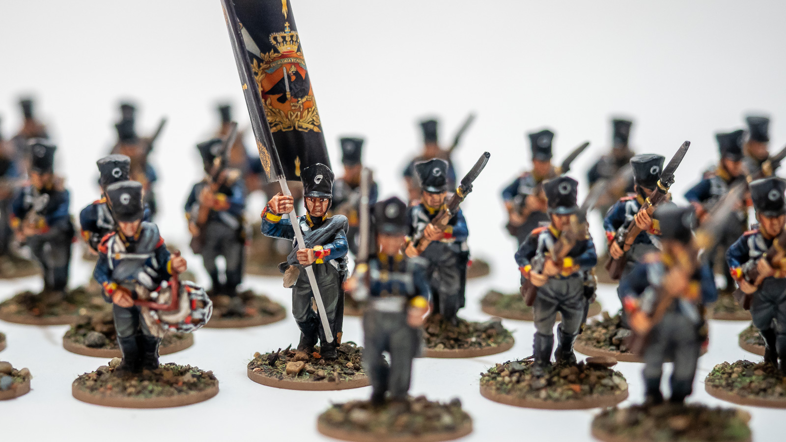 1/2 Endlich nun hat es auch mich in eine Epoche gezogen, die für historisches Tabletop geradezu "klassisch" ist: die Napoleonischen Kriege! Für "Shakos and Bayonets", das Armeebuch, welches das Grundregelwerk "Muskets and Tomahawks" für eben diese Epoche ergänzt, stelle ich - wer mich kennt, hätte es nicht anders erwartet - eine preußische Truppe in der Ausführung nach 1813 auf, also jenes "neue" Preußen, das nach den Reformen und unter dem Eindruck jahrelanger Kriege und Niederlagen eine verblüffende Wandlungsfähigkeit an den Tag legte.