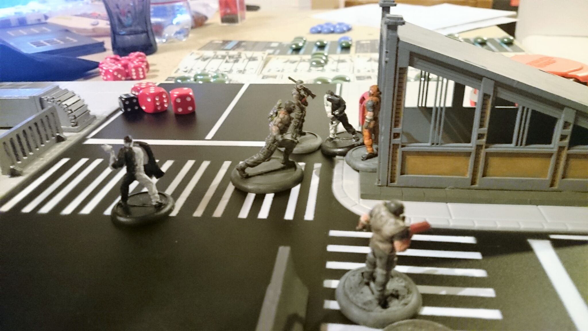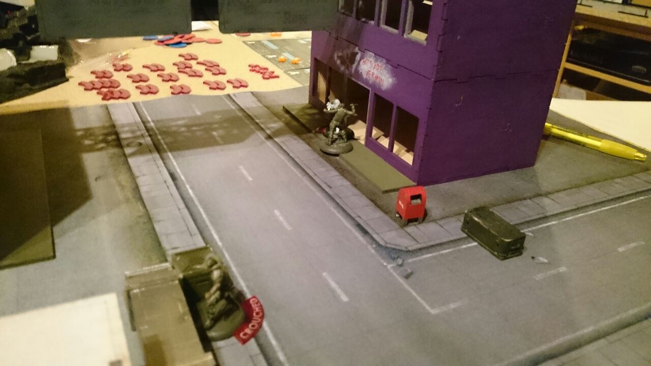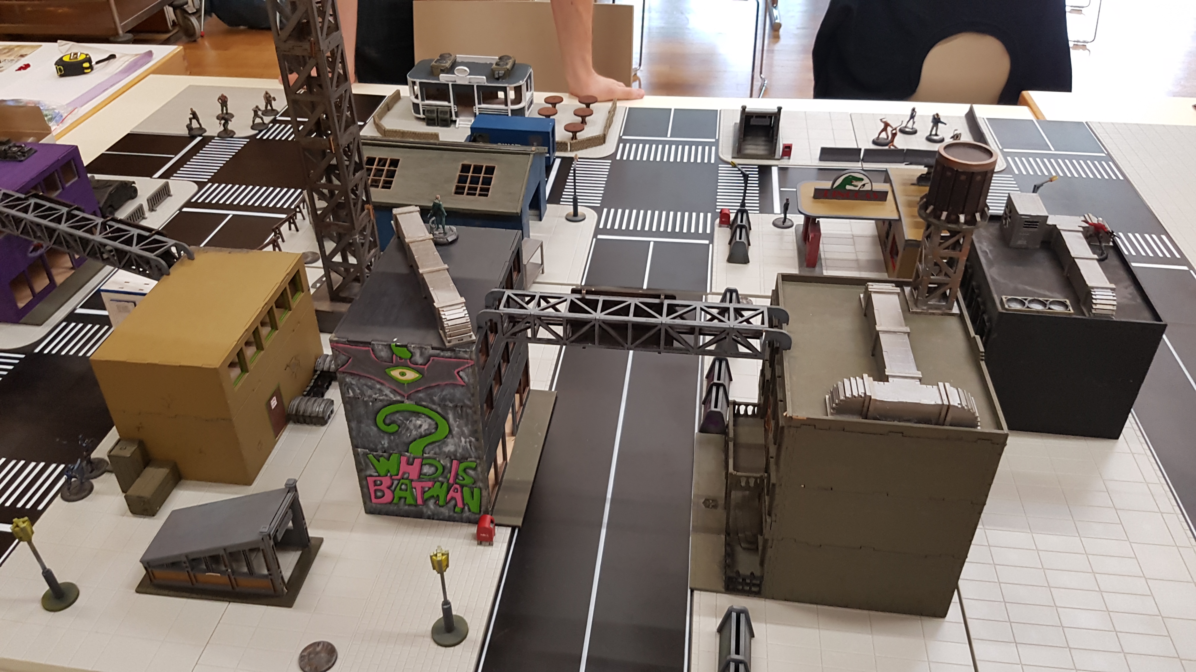 Das Spielfeld: Die Bösen betreten das Feld: Banes Handlanger befreien einen Gefangenen aus dem S.W.A.T. Auto: Und treten mit der einen oder anderen zwielichtigen Person in Kontakt: Verteilt rücken die Angreifer vor: Diggle konnte sich eines Angreifers erfolgreich erwehren, doch der Nächste kommt schon angerannt: Der Serverraum steht kurz vor der Erstürmung... als Batman auf den Plan tritt: Jedoch kann nicht verhindert werden, dass Katana, welche den Serverraum beschützt, überwältigt wird: A.R.G.U.S. bleibt nichts anderes übrig, als die Server zum Schutz herunterzufahren.