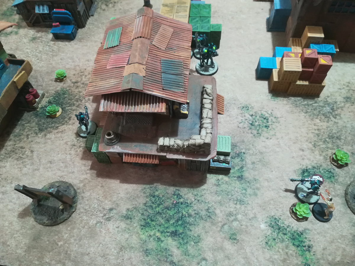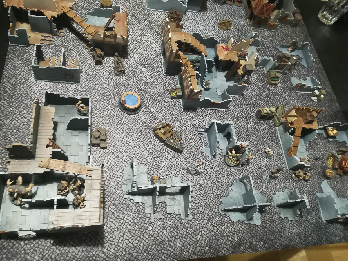 Grimdark Future: Firefight mit meinen Necrons gegen seine Orks in einer Orksiedlung.