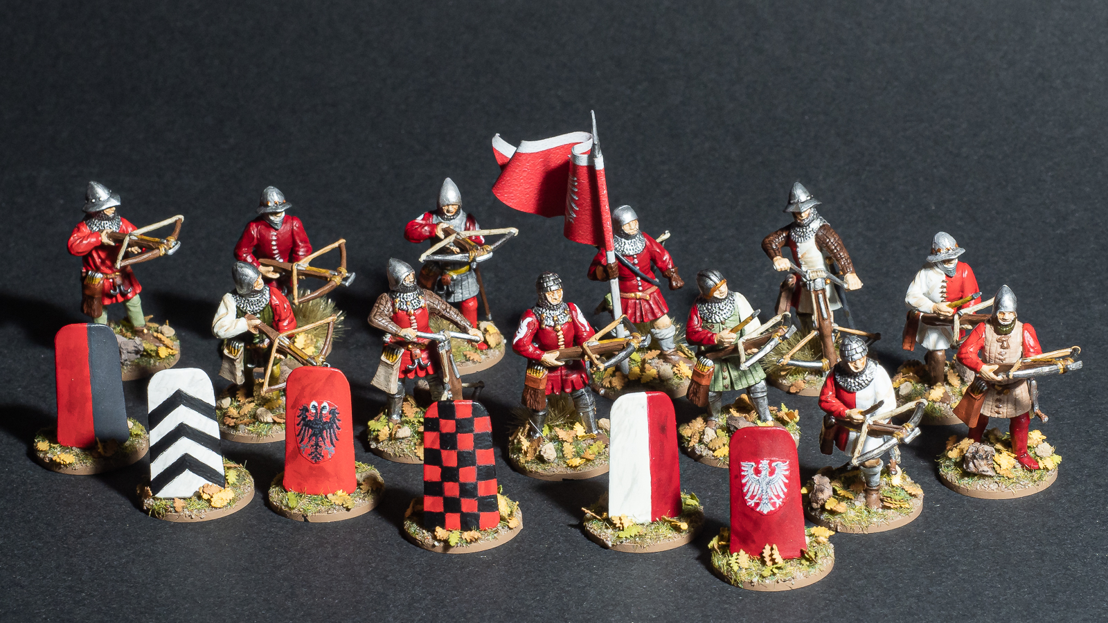 Crossbowmen - Frankfurter (eher ärmere) Bürger, mit der Stadtfahne (weißer Adler). Außerdem - optionale - Pavesen.