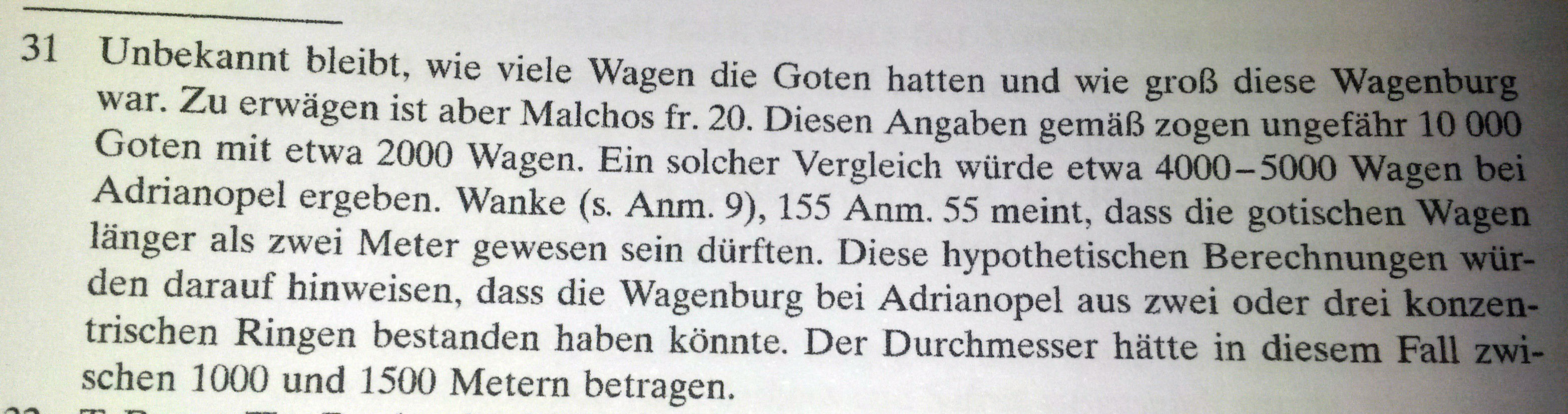 Die Goten bei Adrianopel waren keine reguläre Armee und wie wir wissen, auch kein einzelner Gotenstamm. Ich halte es nach wie vor für viel plausibler (und das unterstelle ich, hat der Osprey Autor vermutlich auch gemacht), dass das Gesamtlager der Goten aus mehreren Lagern (der einzelnen Gruppen wie Greuthingi und andere Goten, ALanen und Hunnen) bestand und das man dort, wo es das Gelände notwendig machte, provisorische Wälle (aus Wagen) aufgebaut hat.