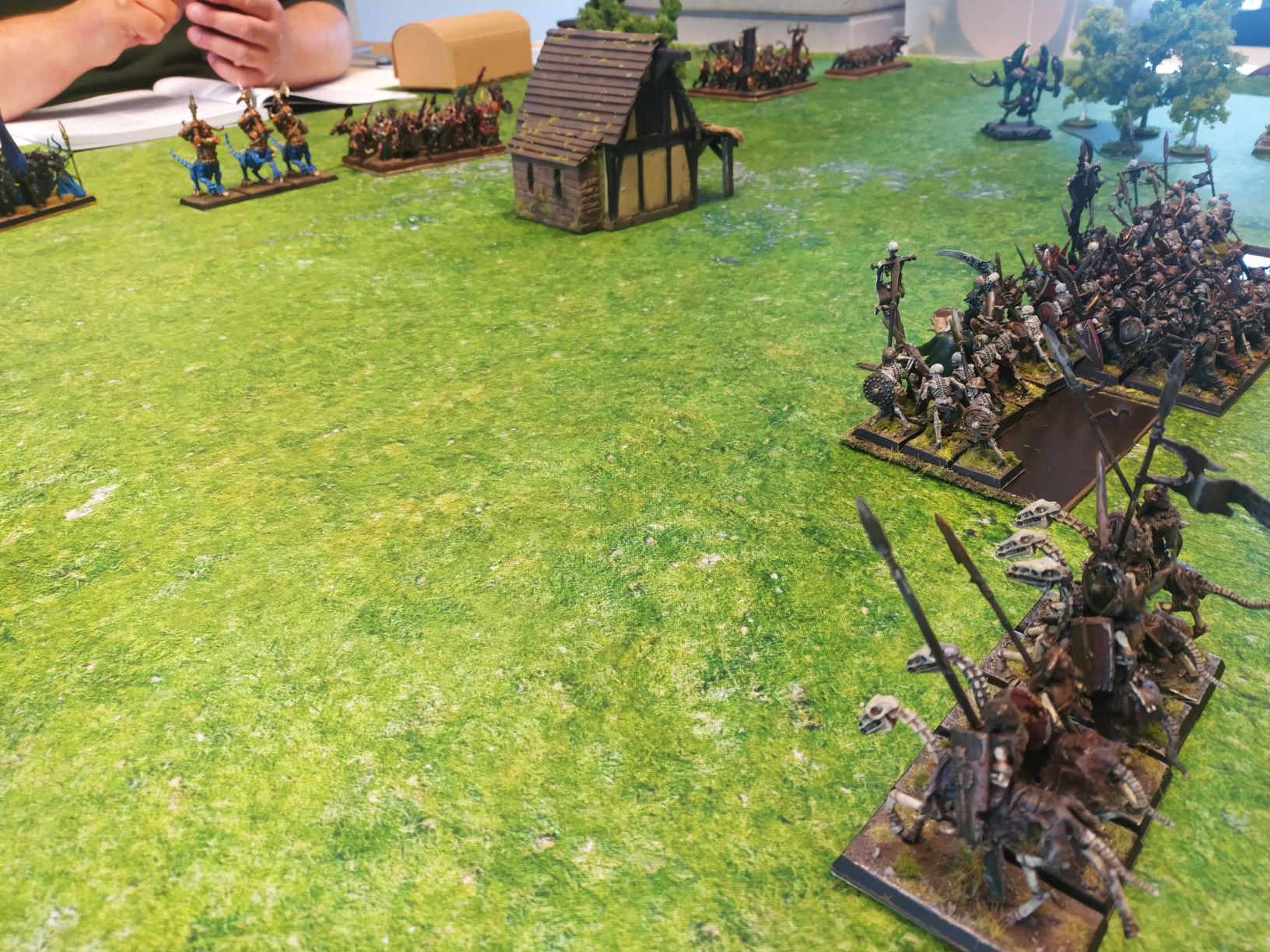 Dann fangen wir mal mit der Aufstellung an. Diese war im Nachhinein betrachtet etwas kopflos. Meine Idee war es, meine 7. Editions-Armee ganz grob abzubilden (ein ähnlicher Versuch vor vielen Jahren gegen Gilb scheiterte kläglich). Ich hatte oft einen Vampirfürst und Fluch-AST zu Fuß in einem 20er Block Verfluchte, dazu ein paar Skelette zum Schutz und eine Einheit Fluchritter mit "Rüdiger", dem kleine Vampir