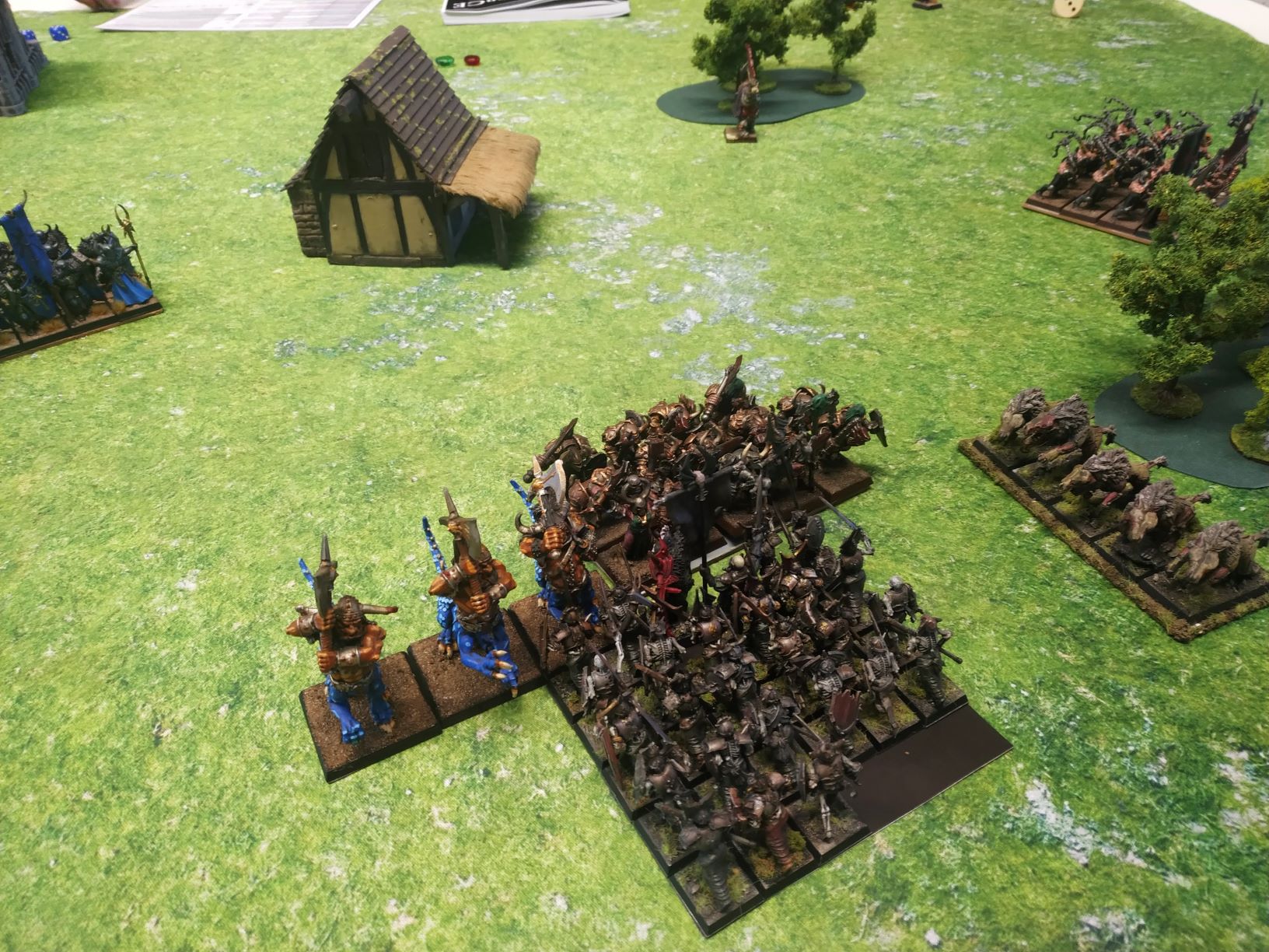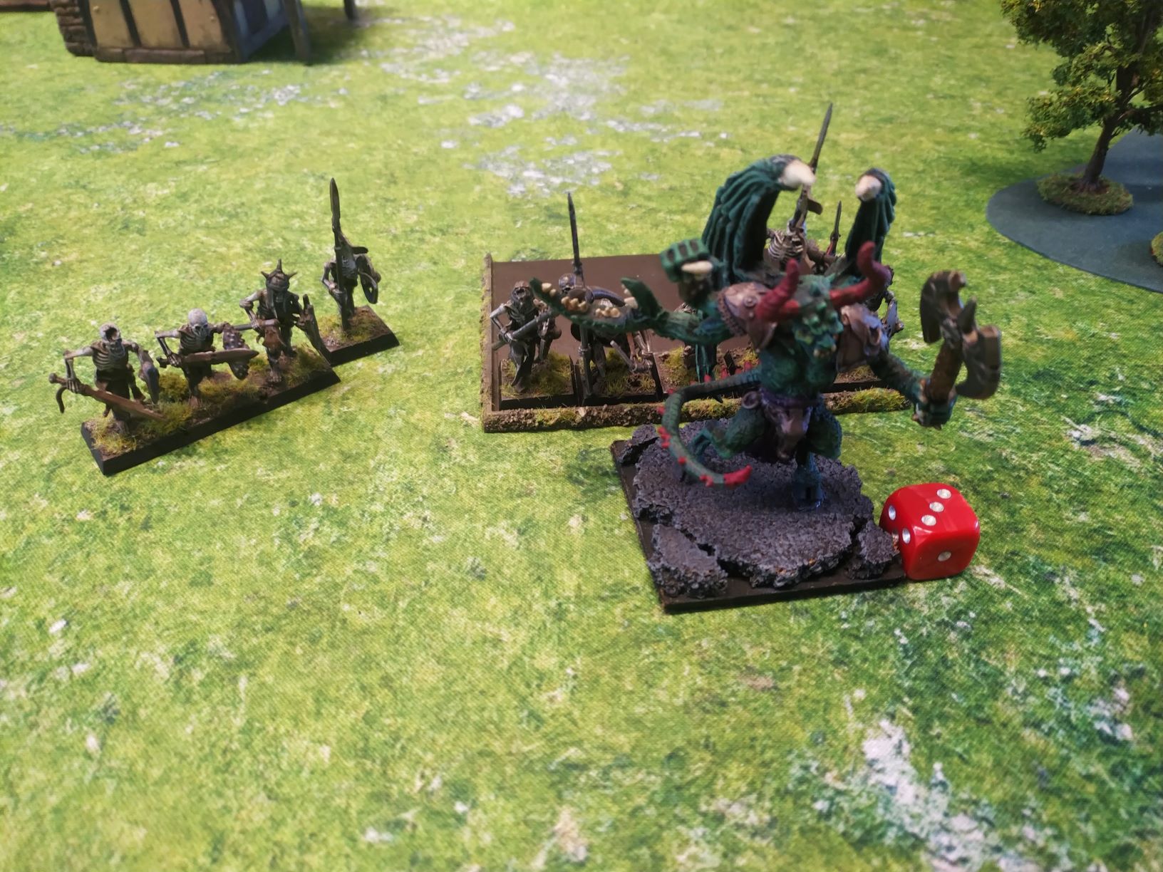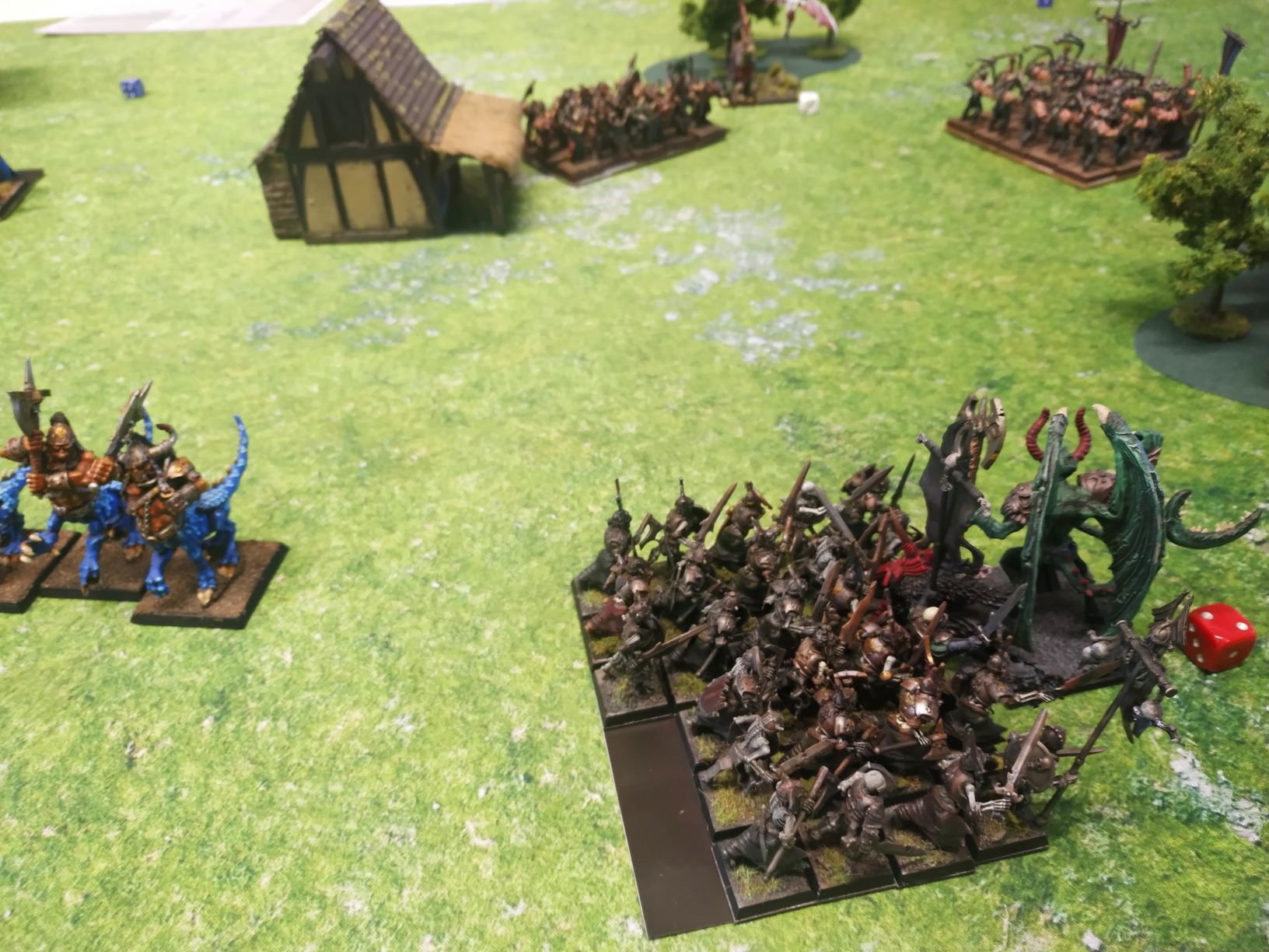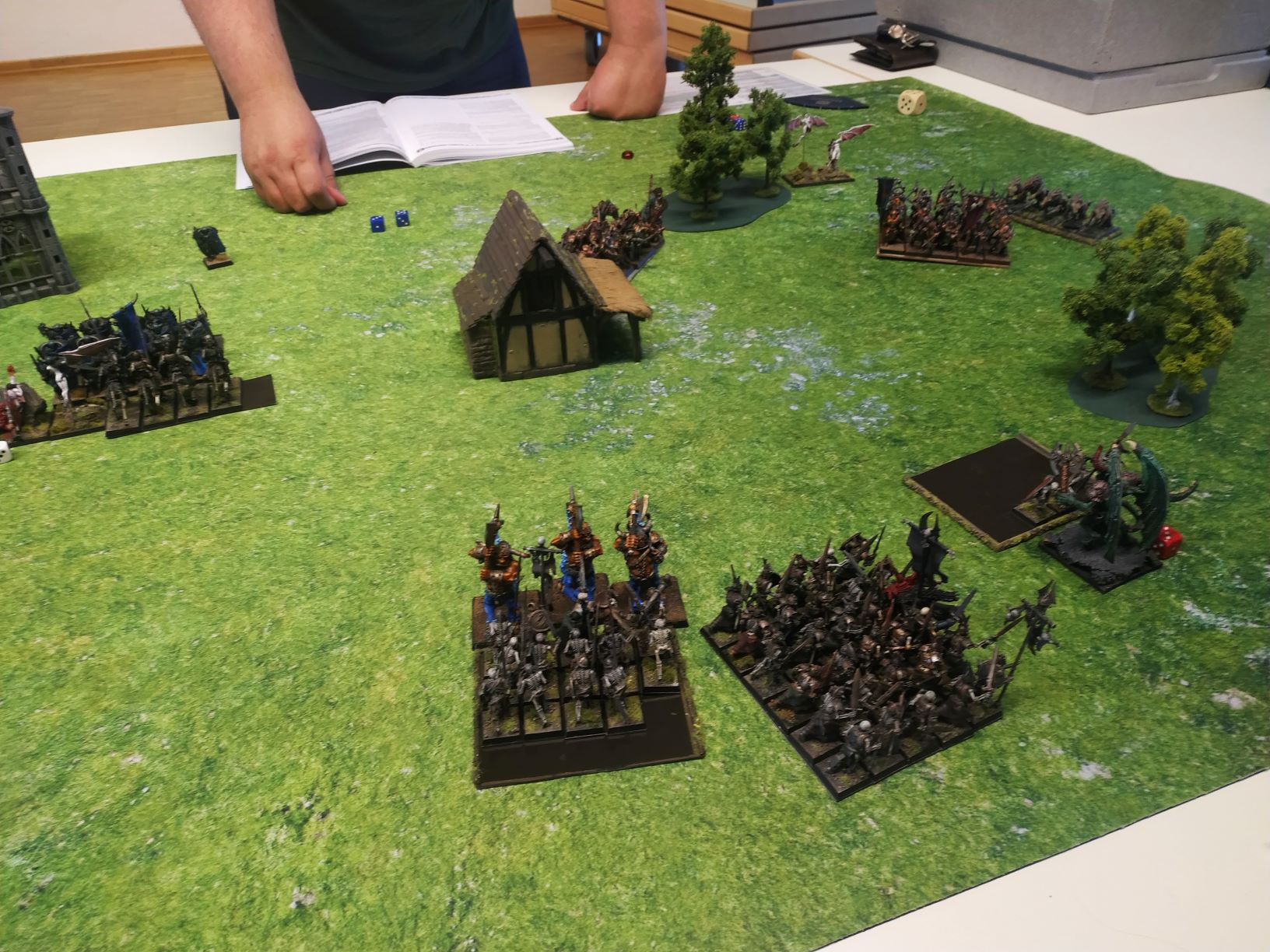 Meine Reihen hatten sich schmerzlich gelichtet. Nun standen die Verfluchten mit Vampirfürst und AST zentral und wurden von den Kriegern und den Drachenogern gleichermaßen angegriffen... Das die Untoten den Nahkampf für sich entscheiden konnten, wollte ich ernst nicht glauben, aber der statische Bonus hat's einfach rausgerissen. Krasse Einheit! Am Ende der sechsten Runde zeichnete sich ein klares Unentschieden ab, was ich eigentlich nicht mehr für möglich gehalten hatte. Für mich ein sehr zufriedenstellendes Ergebnis