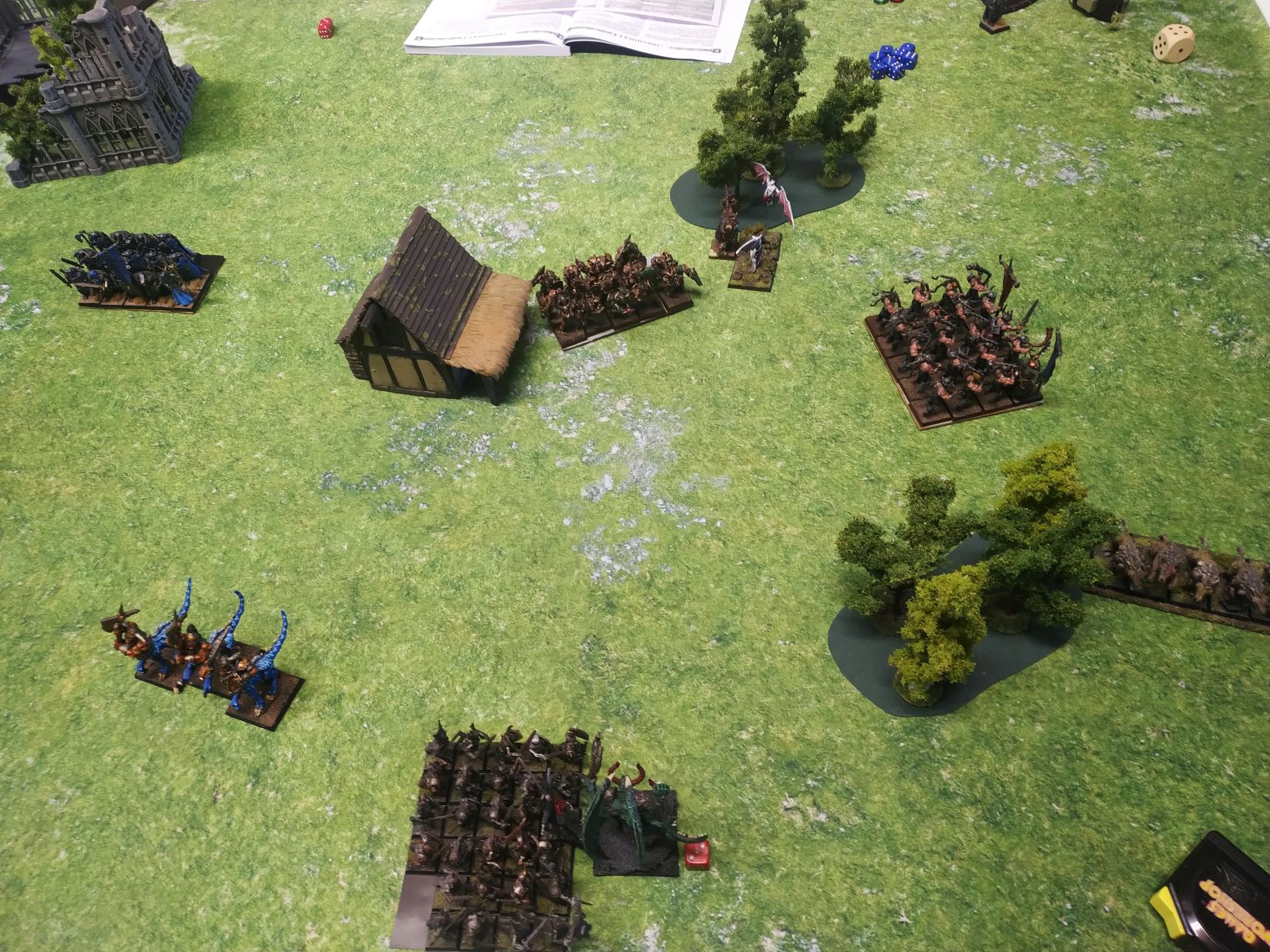 In den ersten beiden Runden passierte nicht sonderlich viel, die Vampire blieben weitestgehend stehen oder richteten sich aus, die Flankeneinheiten manövrierten etwas. Dann kam es zum ersten Nahkampf! Der Dämonenprinz preschte nach vorne und suchte den Zweikampf mit dem Varghulf, und entscheid in ganz klar für sich Dann passierte etwas Aberwitziges: Die Skelette suchten den Nahkampf mit dem Dämonenprinzen und hielten ihn dank ihres Untoten Daseins lange beschäftigt, bis sie schließlich das Staffelholz bzw den -knochen an die Verfluchten übergaben, welche den Dämonenprinz besiegen konnten. Mittlerweile konnten sich die Fläuse und die Wölfe auf der rechten flanken gegen die Hunde behaupten und etwas Unruhe stiften. Die Chaoskrieger auf der linken Flanke wurden von Fläusen und Fluchrittern angegriffen, was sich als Dummheit herausstellte. Dafür waren die Einheiten zu schwach und zu klein. Die Drachenoger wurden magisch stets aufgemotzt und mischten das Zentrum ganz schön auf. Meine größte Sorge.