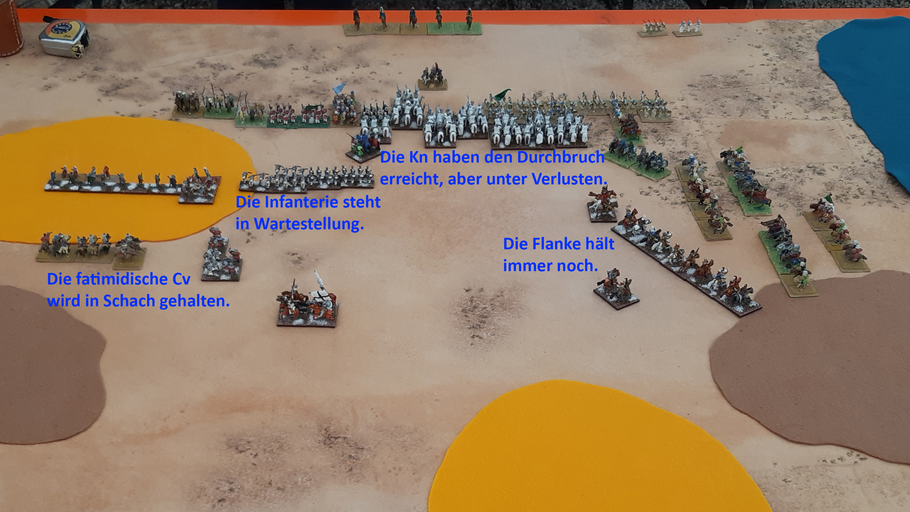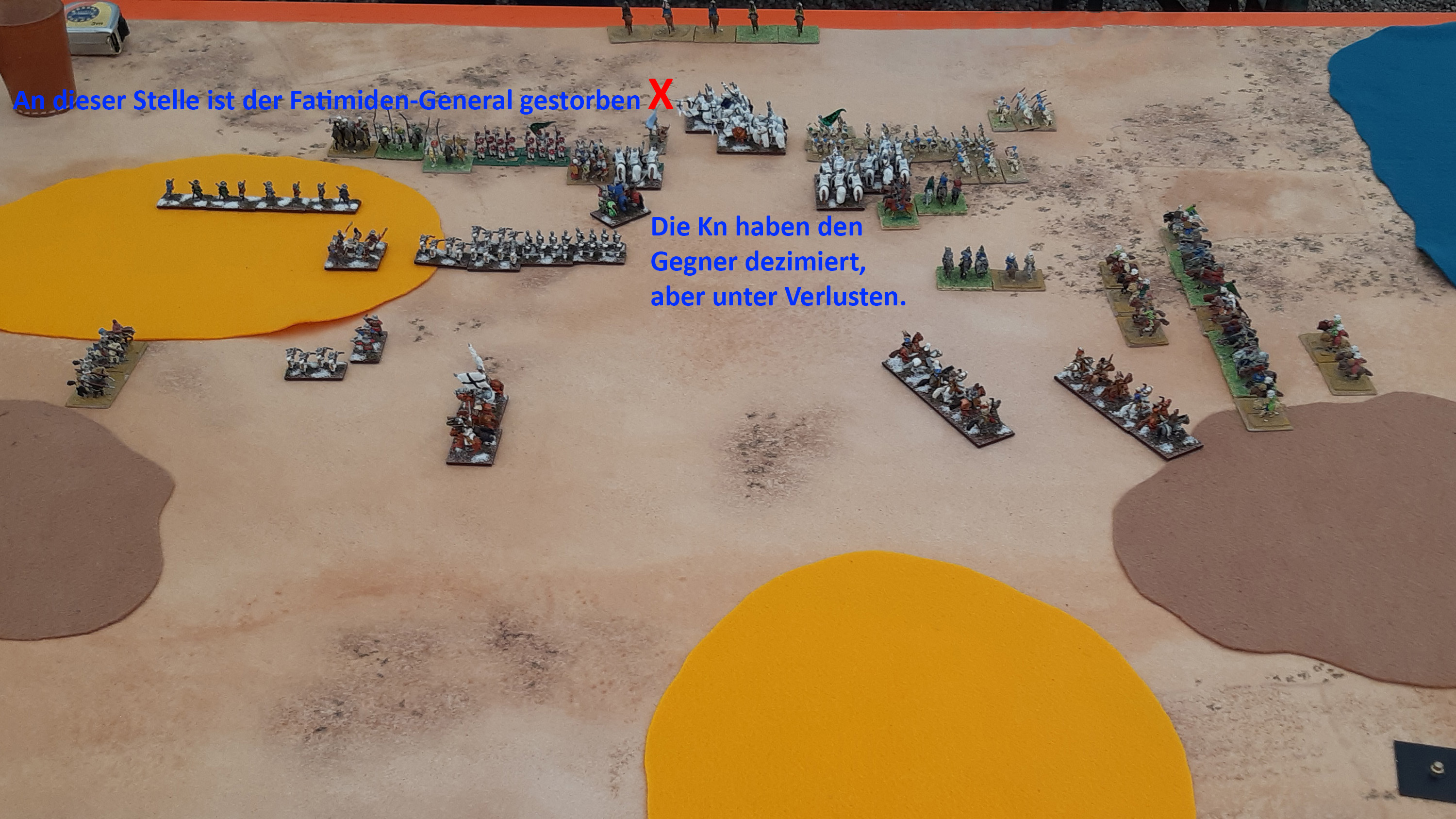 Und das ist im Prinzip auch genauso aufgegangen: Mit viel Glück gelang es einem der Ritterkeile, einen gegnerischen General umzubringen! Der Fatimiden-General hatte in der Runde zuvor einen Ritterkeil des Ordens vernichtet, aber für den Preis, dass er nun isoliert stand und mit einem Ritterkeil plus Overlap attackiert werden konnte. Der Verlust des Generals führte dazu, dass sein Kommando gebrochen wurde, und die Übertragung der Strafpunkte ließ die gesamte Armee der Fatimiden zusammenbrechen.