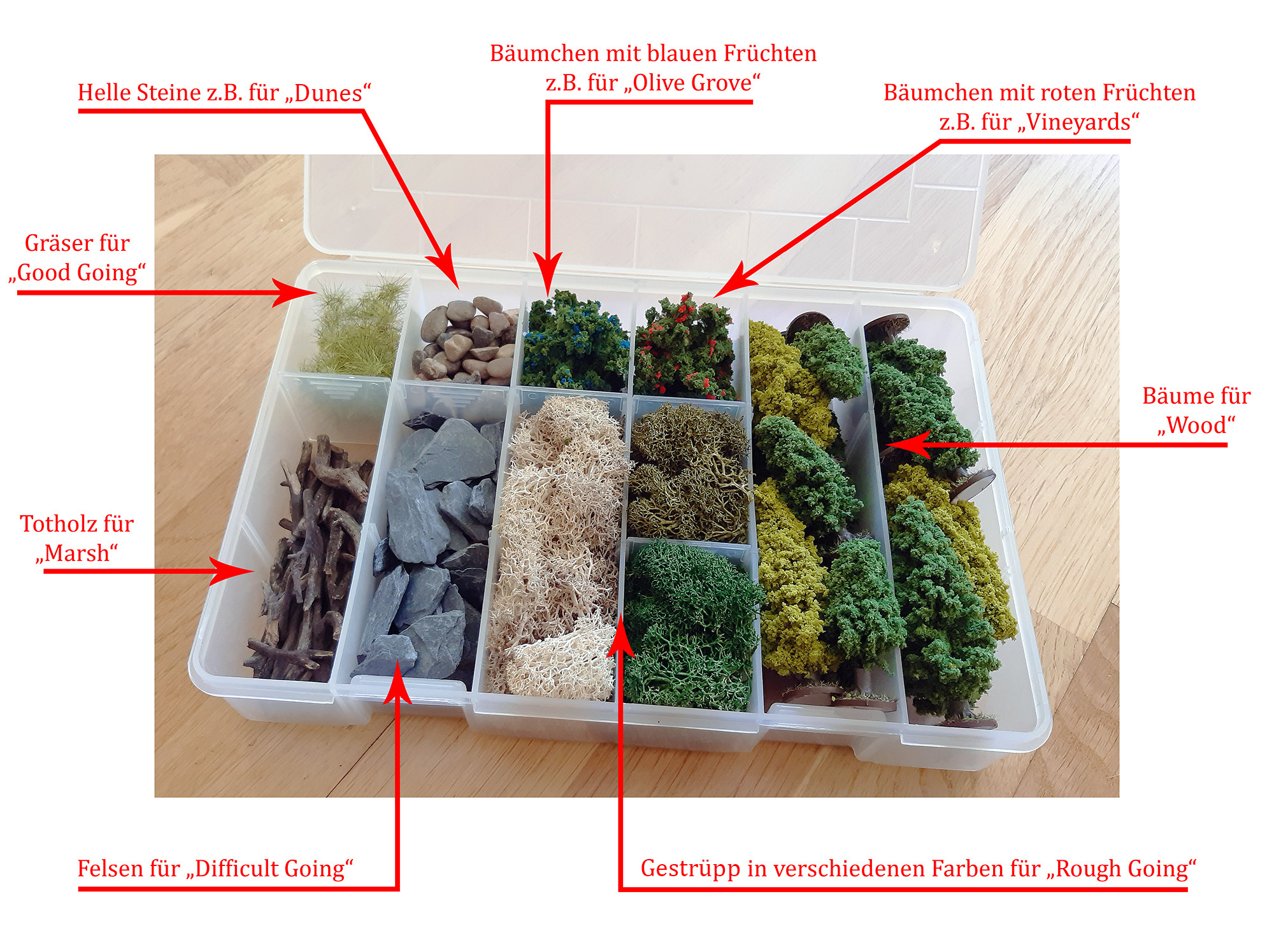 Keine große Sache, aber etwas, das schon seit längerer Zeit auf meiner To-Do-Liste stand und das ich jetzt endlich geschafft habe: Eine Box mit diversen Geländeteilen, um die DBMM-Schlachtplatten zu garnieren :D Klein, leicht und transportabel, wie immer bei mir, um es per Fahrrad oder Öffis mitnehmen zu können.