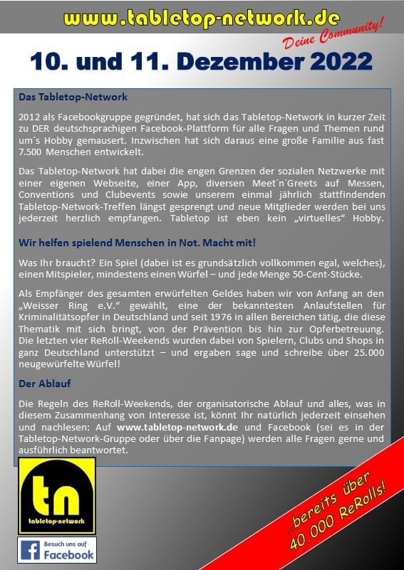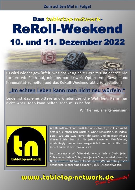 In der Facebook-Gruppe "Tabletop-Network" gibt es das sog. ReRoll-Weekend. So wie ich das mitbekommen habe sind die Regeln folgende: An dem ReRoll-Wochenende kann in JEDEM Tabletop JEDER Würfelwurf wiederholt werden. Es kostet aber pro ReRoll 50 Cent!