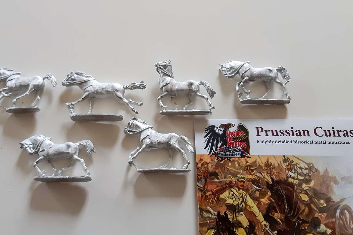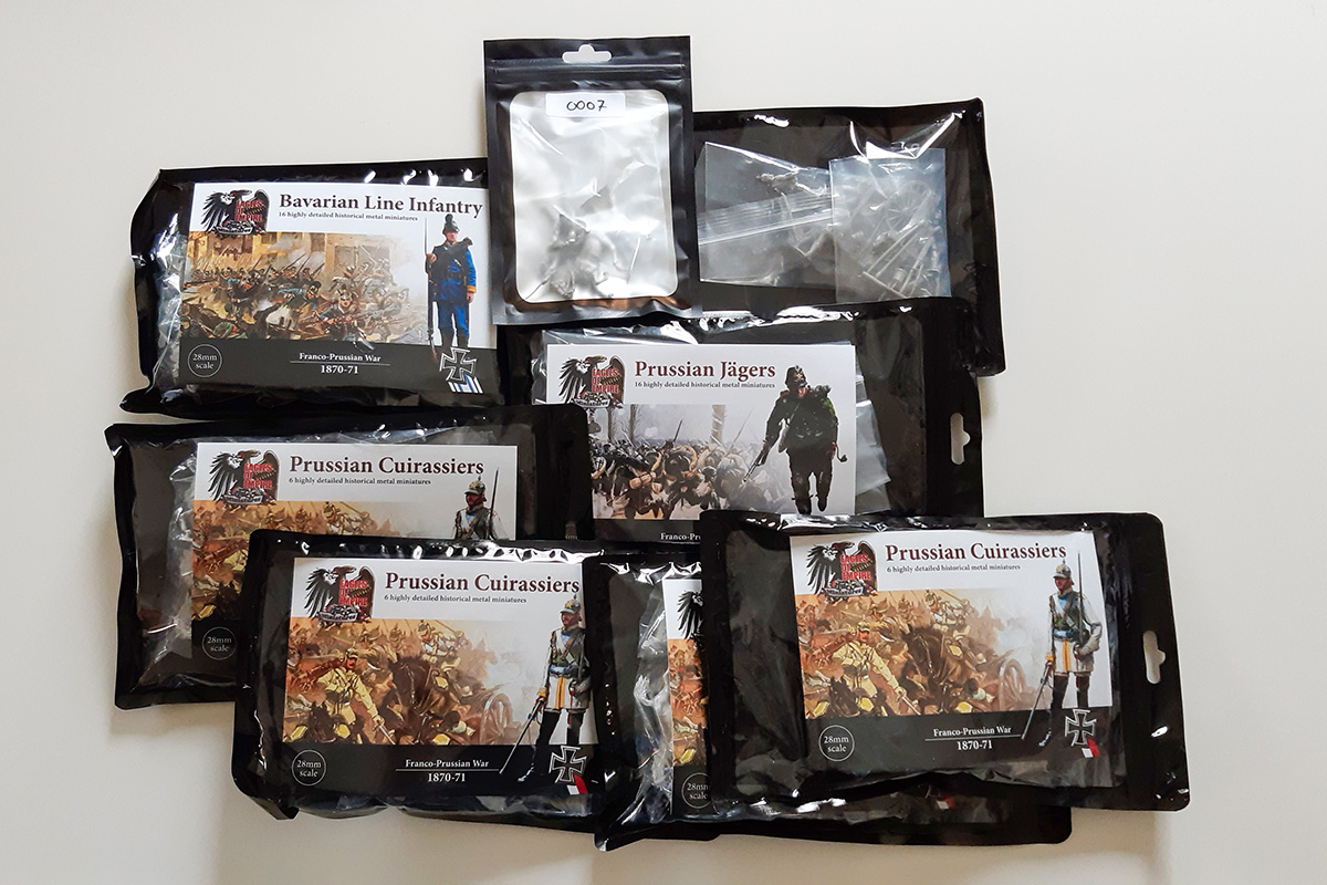 Squads sind nach dem dritten Treffer vernichtet, d.h. man entfernt nicht eine einzelne Figur, sondern stets mehrere (z.B. beim ersten Treffer 2, beim zweiten auch 2, beim dritten 3). Deshalb sollten die Figuren nach Möglichkeit auch entsprechend in 2er- oder 3er-Gruppen basiert sein, was aber kein Muss ist (mache ich auch nicht so, damit sie auch mit anderen Regelwerken kompatibel sind. Ich werde aber wahrscheinlich Movement Trays verwenden). Bei Kavallerie ist es im Prinzip so ähnlich. Außerdem gibt es noch Artillerie sowie für die Franzosen Mitrailleusen.