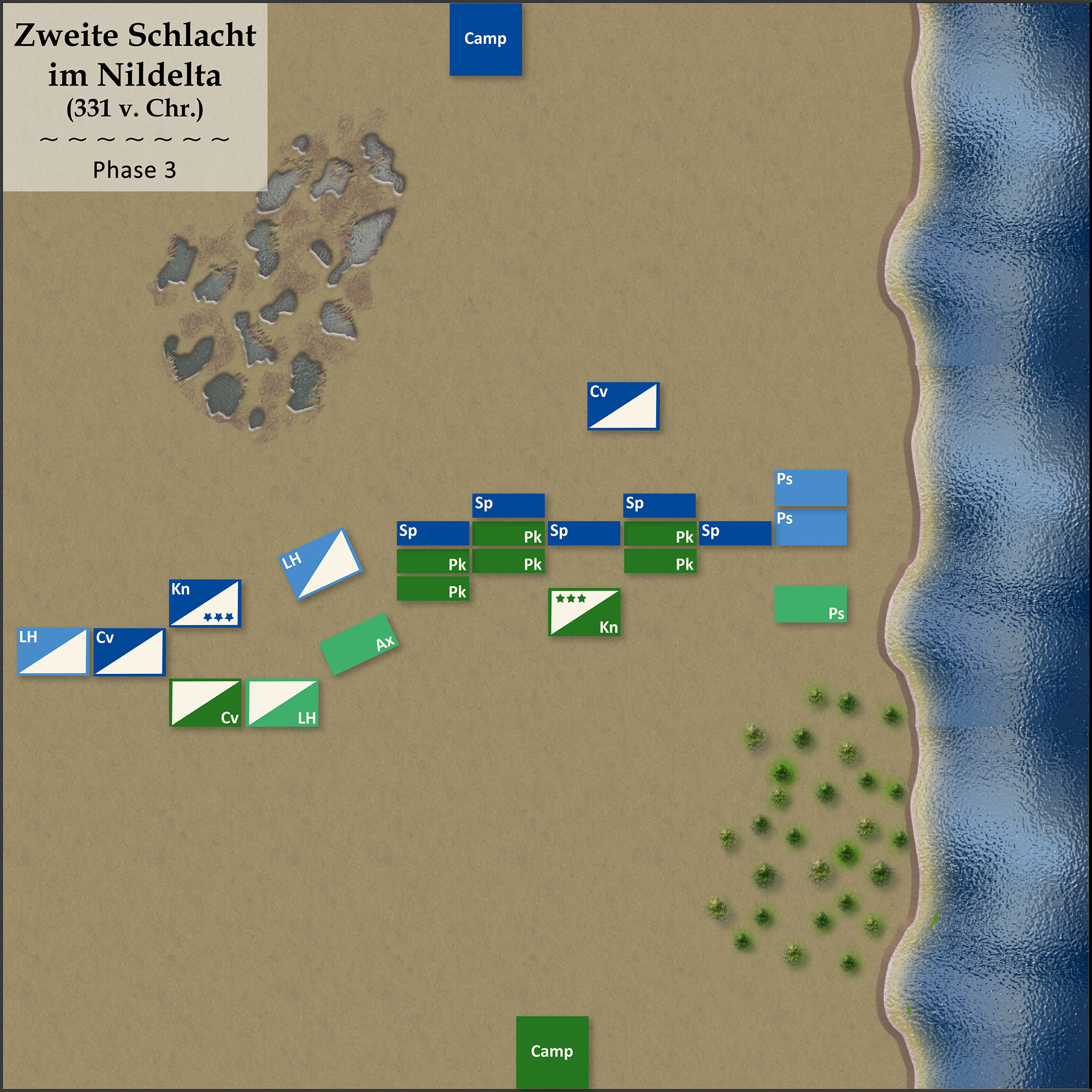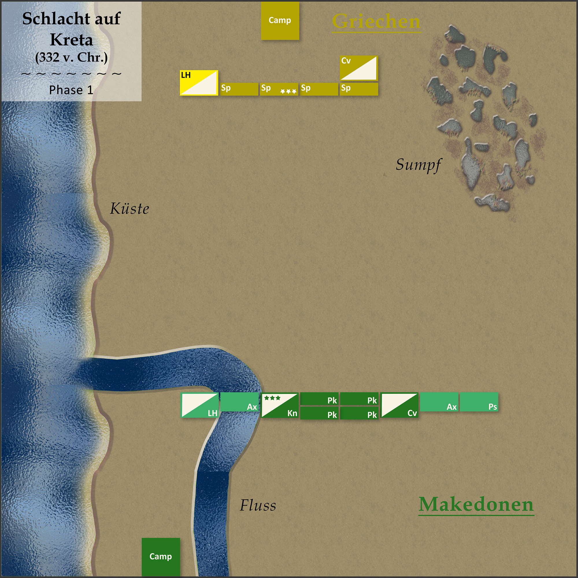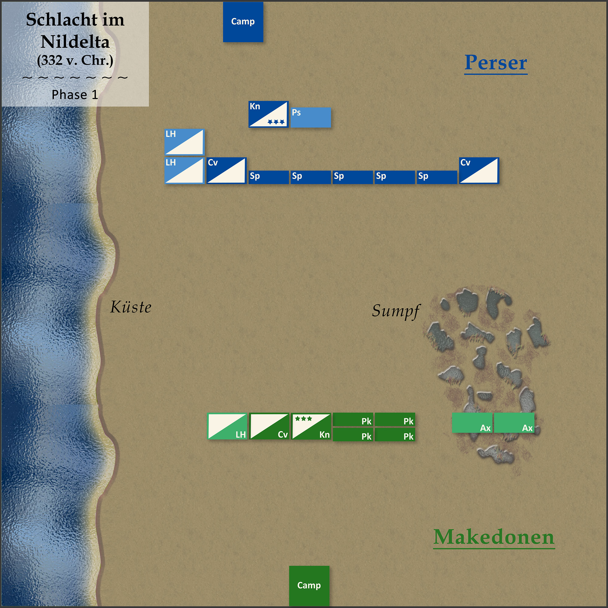 (1) Die verteidigenden Perser legten eine Küstenlinie, einen Sumpf und einen Wald. Die Makedonen wählten als Schlachtfeldseite diejenige mit dem Wald, da dieser, anders als der Sumpf, zusammen mit der Küste einen lückenlosen Flankenschutz bis zum Schlachtfeldrand bot. Die Perser mussten ihre Armee zuerst aufstellen. Sie positionierten ihre Truppen zwischen dem Sumpf und der Küstenlinie: Eine lange Linie Speerkämpfer (Sp) aus Hoplitensöldnern, flankiert von medischer Kavallerie (Cv) auf dem rechten Flügel (hier und im Folgenden aus Blickrichtung der Makedonen) und Plänklern (Ps) auf dem linken Flügel im Sumpf. In Reserve hinter den Speerkämpfern stand die Hauptmasse der Reiterei - eine zweite Abteilung medischer Kavallerie (Cv) sowie der C-in-C mit schweren Panzerreitern (Kn). Zwei Einheiten leichter Reiterei (LH) lauerten hinter dem Sumpf.