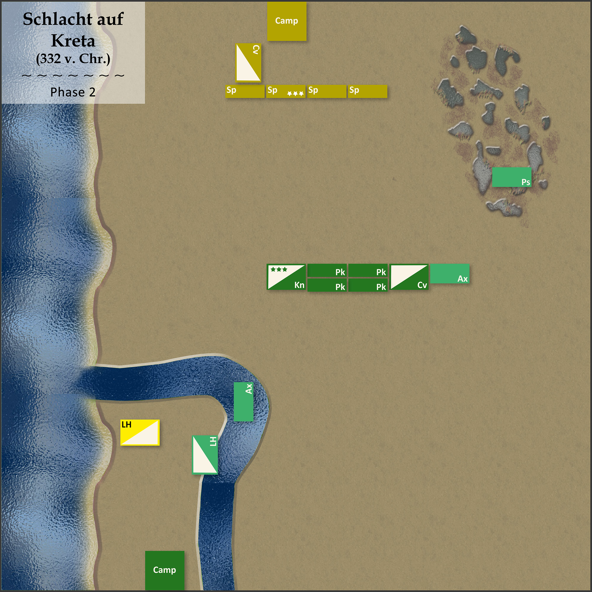 (1) Die Perser wählten als Verteidiger eine Küstenlinie und einen Sumpf. Die Makedonen entschieden sich daraufhin für die Schlachtfeldseite mit dem Sumpf als Aufmarschgebiet für ihre Armee. Dieser würde einen wirksamen Flankenschutz für ihre numerisch unterlegende - und potentiell leicht auszuflankierende - Armee abgeben. Die Perser stellten ihre Armee zuerst auf. Im Zentrum platzierten sie eine mächtige Linie aus Speerkämpfern (Sp), die vollständig aus Hoplitensöldnern bestand. Auf dem linken Flügel (hier und im Folgenden aus Blickrichtung der Makedonen) beorderten sie die Hauptmasse ihrer berittenen Truppen: Eine Einheit medischer Kavallerie (Cv), flankiert von zwei Einheiten leichter Reiterei (LH). Auf dem rechten Flügel stand ebenfalls eine Einheit medischer Kavallerie (Cv). Der persische C-in-C stationierte sich mit seinen schweren Panzerreitern (Kn) in Reserveposition hinter den Hopliten, begleitet von Plänklern (Ps).