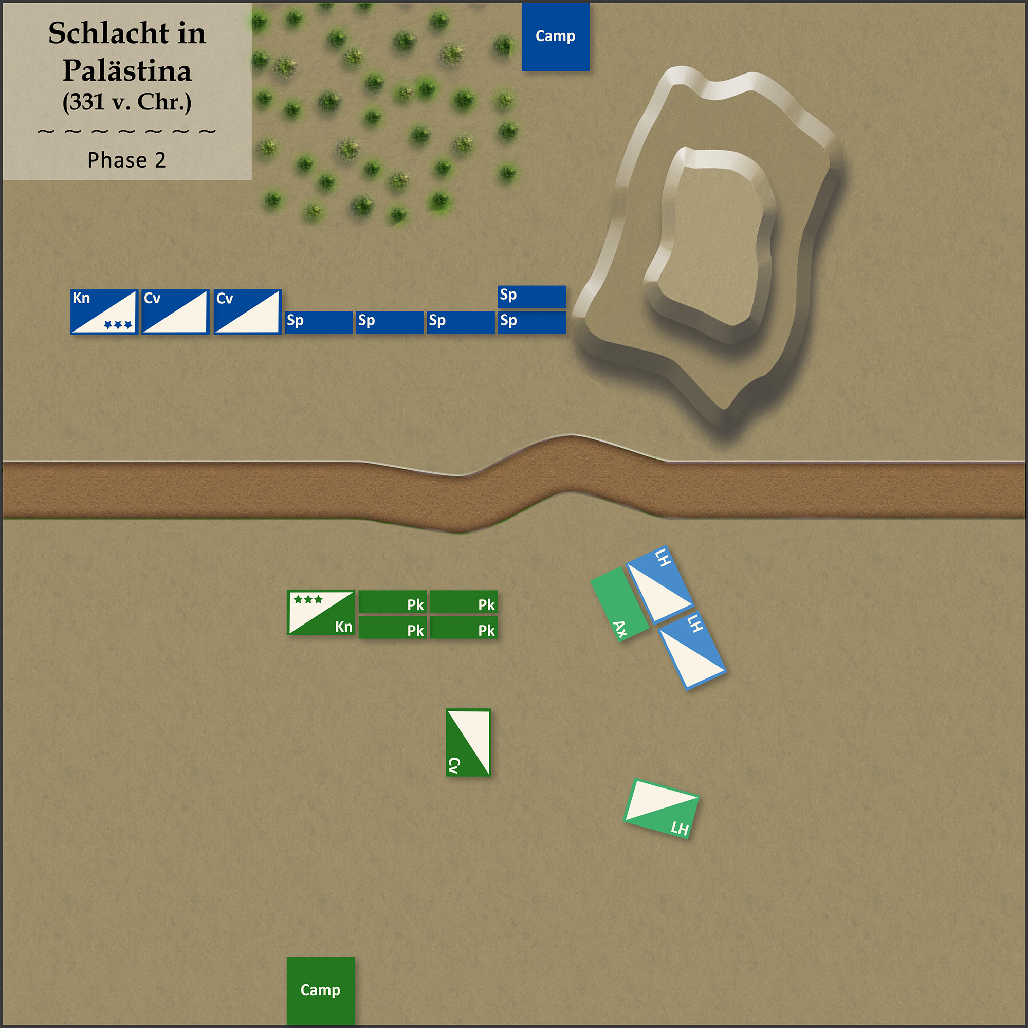 Die Perser positionierten den Hauptteil ihrer Armee mit dem Wald im Rücken direkt der makedonischen Armee gegenüber. Am Hügel verankerten sie die rechte (hier und im Folgenden aus Blickrichtung der Makedonen) Flanke ihrer Linie aus Speerkämpfern (Sp), auf dem linken Flügel nahm die Reiterei - zwei Verbände medischer Kavallerie und, hinter der Infanterie versetzt, der C-in-C mit Panzerreitern. Auf der anderen Seite des Hügels standen zwei Einheiten leichter Reiterei (LH).
