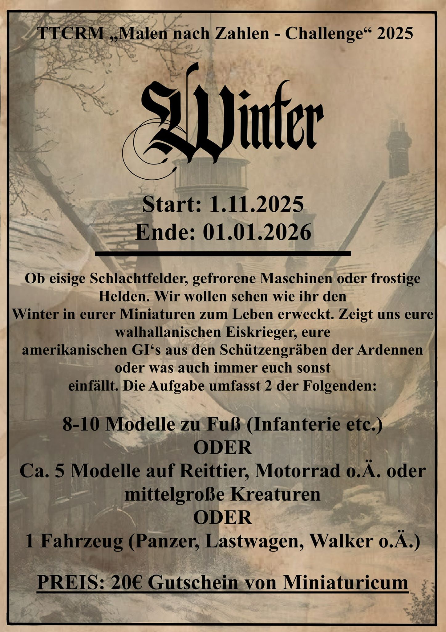 Zeigt uns den Winter in euren Miniaturen - eisige Schlachten, gefrorene Maschinen oder frostige Helden. Zeigt uns eure valhallanischen Eiskrieger, eure amerikanischen GI's aus den Schützengräben der Ardennen oder was auch immer euch sonst einfällt!