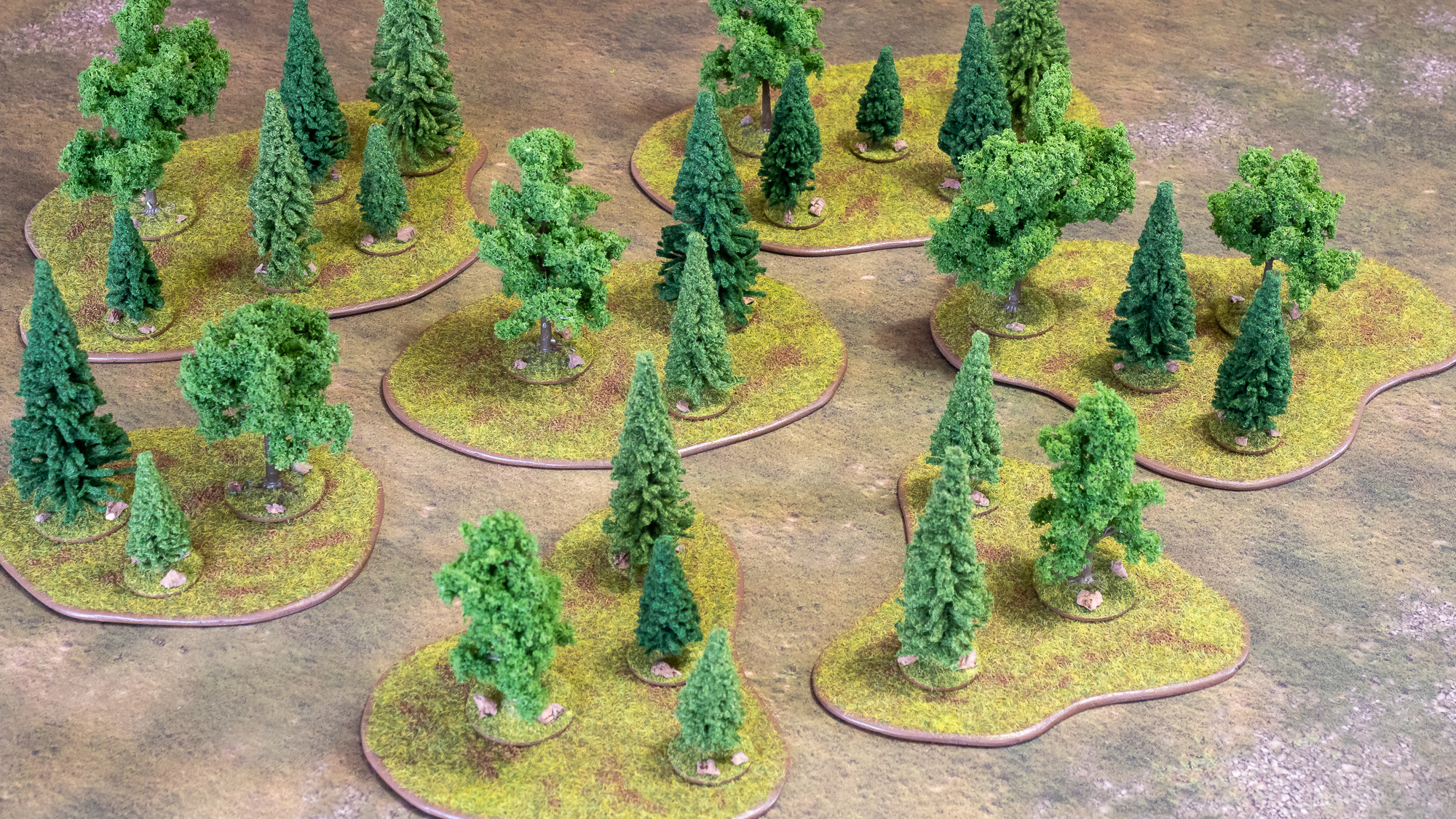 Wälder, selbst gebastelt aus zurecht gesägten Holzplatten und Miniaturbäumen aus dem Modellbahn-Zubehör.