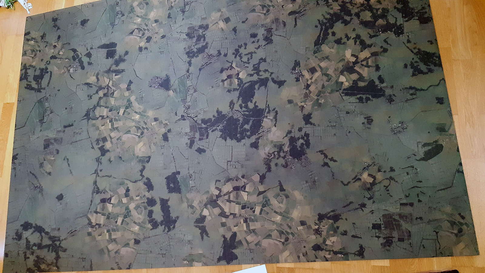 Ich orientiere mich an der Spielmatte "Aerial Countryside" von DeepCut Studio, welche ich in der Mitte zerschnitten habe, so dass sich das im Regelwerk von Neil Thomas vorgeschlagene Spielfeld von 120 cm x 90 cm für große Schlachten ergibt. Für dieses Spielfeld, auf dem Geländedetails (Ortschaften, Wälder, Ackerflächen) bereits aufgedruckt sind, habe ich einen realistischen Maßstab von 1:7500 ermittelt, d.h. 1 cm auf der Matte entsprechen 75 m in der Realität. Das Schlachtfeld hat also eine Ausdehnung von 9 km x 6,75 km.
