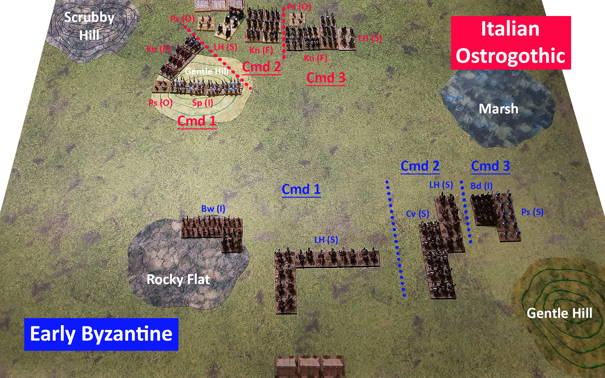 (1) Die Byzantiner, aggressiv wie immer, waren die Angreifer. Sie wählten einen kleinen, mit Büschen bewachsenen Hügel, der am hinteren Rand der ostgotischen Aufstellungszone landete, sowie eine kleine felsige Ebene, die wunschgemäß in der eigenen Aufstellungszone gelegt werden konnte. Die Ostgoten wählten einen kleinen Sumpf, den sie in ihrer linken Aufstellungszone legen konnten, zwei kleine sanfte Hügel, von denen einer in ihrer Zone - der Felsebene gegenüber - gelegt wurde, während der andere ganz hinten in der byzantinischen Zone landete. Sie wählten außerdem eine Straße, die aber nicht gelegt werden konnte. Alles in allem war es ein recht vorteilhaftes Schlachtfeld für die Ostgoten, die mit dem sanften Hügel über eine gute Defensivposition und mit dem Sumpf über einen wirksamen Flankenschutz verfügten.