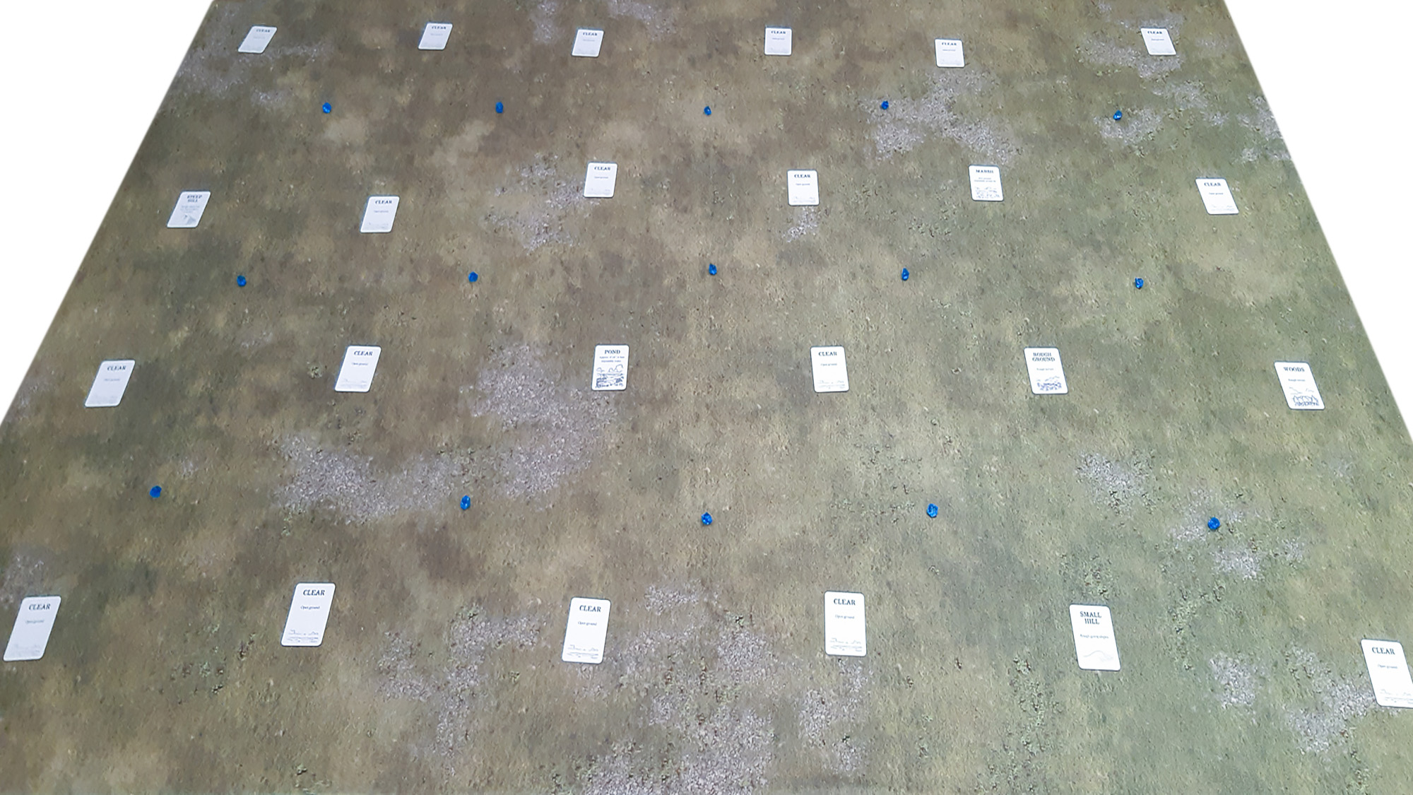 Abweichend vom regulären Regelwerk wurde jeder der 24 Sektoren des Tisches mit einer Geländekarte aus dem zuvor gemischten Kartendeck belegt. Vor dem Auslegen kann man entscheiden, ob die Schlacht in dichtem, durchschnittlichem oder offenem Gelände ausgetragen werden soll - entsprechend viele Geländekarten mit dem Wert "Clear" sind dem Kartendeck beigefügt. Die beschriebene Schlacht fand in offenem Gelände statt. Das meiste Terrain lag an den Rändern des Schlachtfelds, wobei als besonders relevant der steile Hügel und der Sumpf hervorzuheben sind: ersterer ist unpassierbar für Berittene, letzterer ist unpassierbar für alle Truppen außer Plänkler (Skirmishers). Zentral befand sich ein kleiner Teich, der vollständig unpassierbar ist.