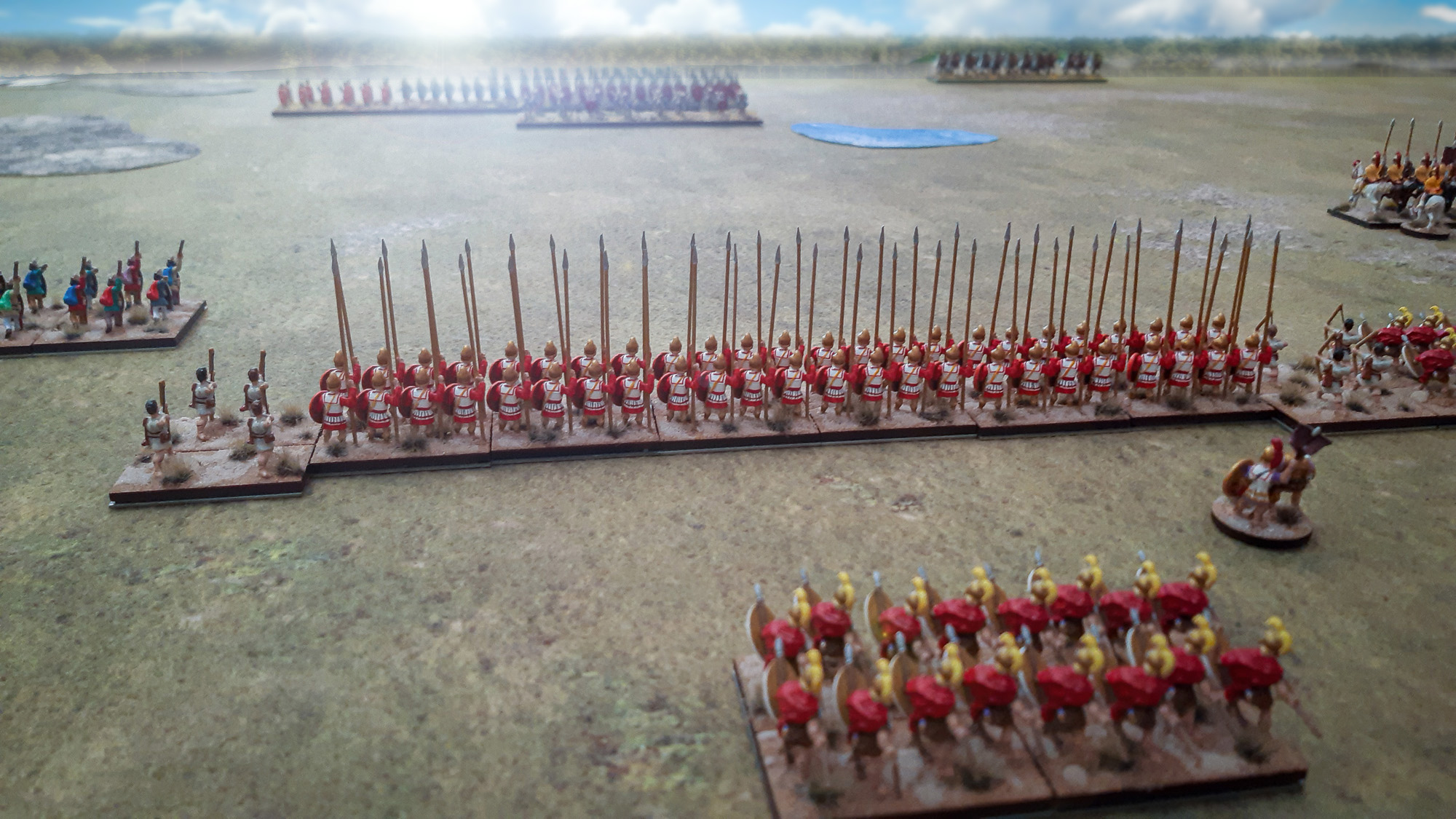 (1) Aufstellung der Armeen. Das seleukidische Heer, als Verteidiger agierend, betrat als erstes das Schlachtfeld. Die Würfel entschieden zudem, dass sie an der oberen Tischkante Aufstellung nahm. Ihre gesamte Kavallerie wurde mit einem klar offensiven Auftrag auf dem leicht exponierten linken Flügel konzentriert: außen die Thessalier (Light Horse), gefolgt von der seleukidischen schweren, teilweise gepanzerten Kavallerie (Heavy Horse). Im eher defensiven Zentrum standen links griechische Hopliten (Spears), daneben eine kleine Abteilung rhodesischer Bogenschützen (Archers), gefolgt von einer beeindruckenden, wenngleich aus unerfahrenen Kämpfern bestehenden Formation makedonischer Phalanx (Pikes), wiederum flankiert von einer kleinen Abteilung rhodesischer Bogenschützen. In der Reserve, hinter der Phalanx, positionierten sich weitere Hopliten. Der rechte, offensiv ausgerichtete Flügel bestand innen aus einem persischen Aufgebot (Light Infantry) und ganz außen, dicht am Rand des Sumpfes, aus griechischen Peltasten (Skirmishers).