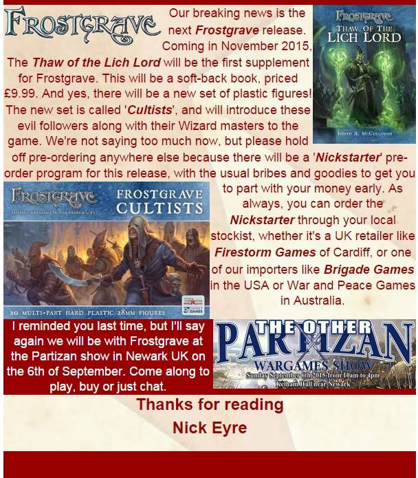 "The next supplement for Frostgrave will be Thaw of the Lich Lord, due out 20th November 2015. There will be new figures, including a plastic box set, coming out with it.