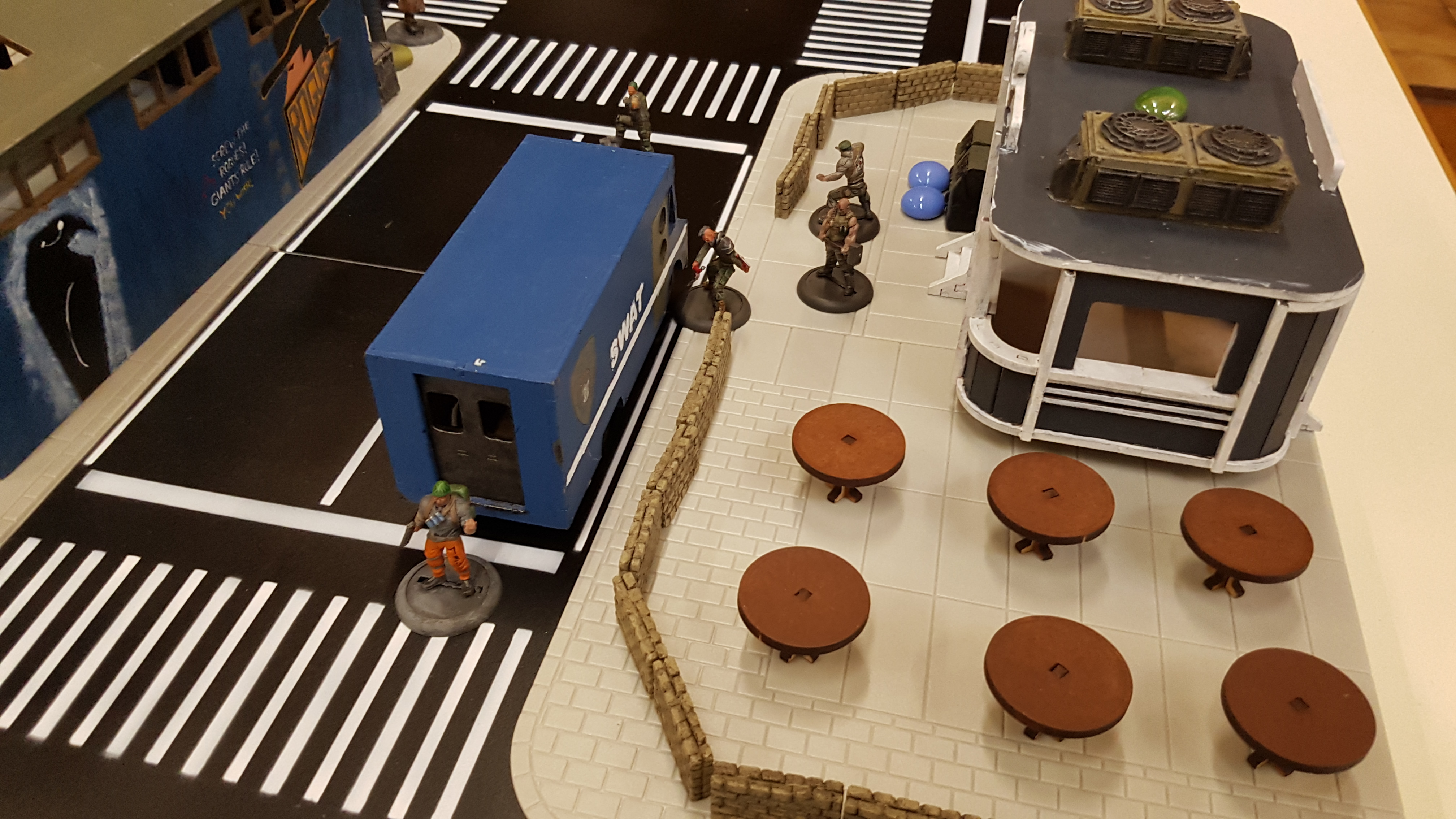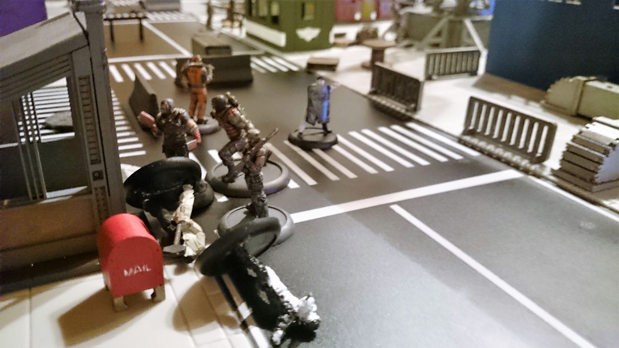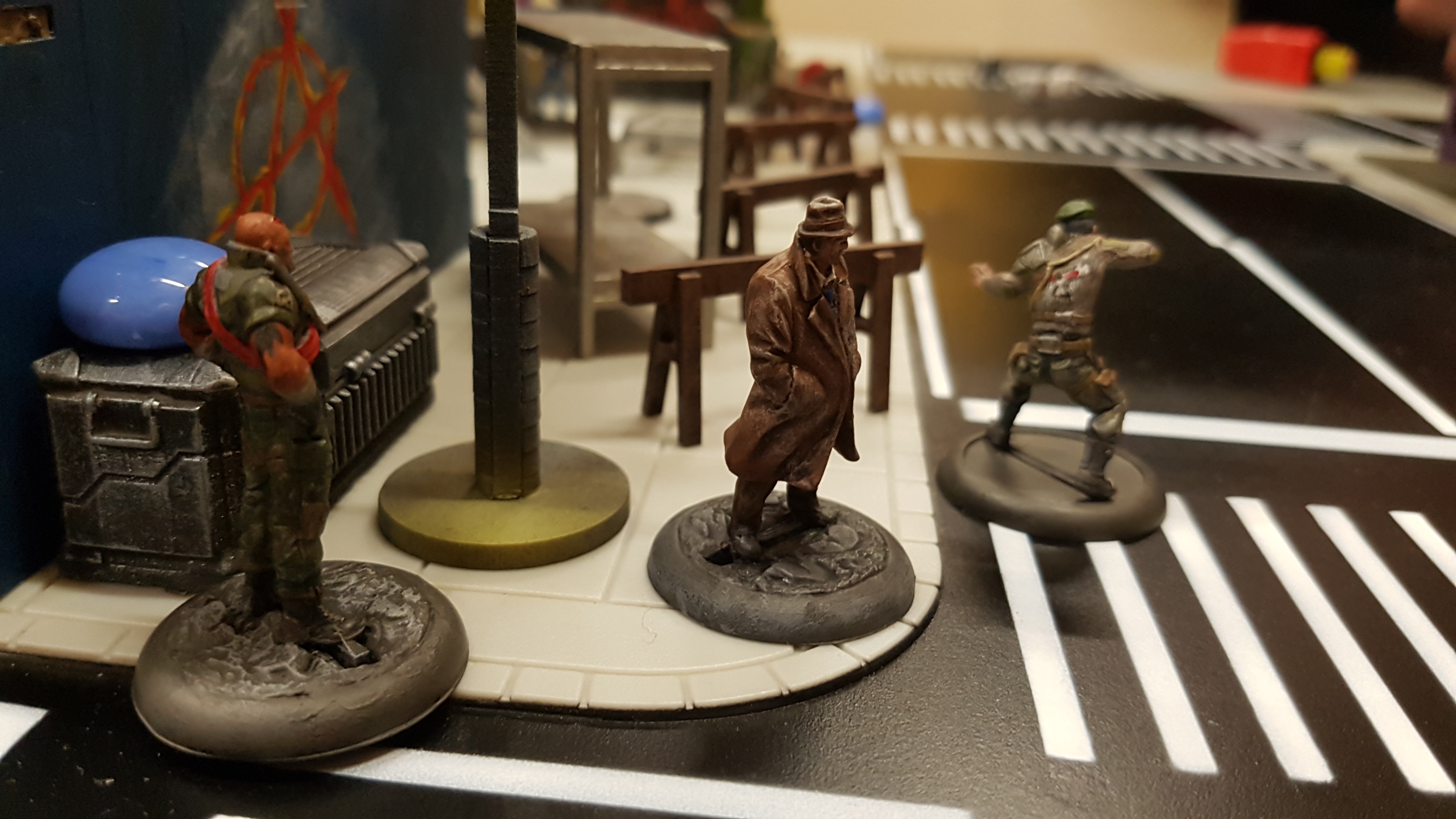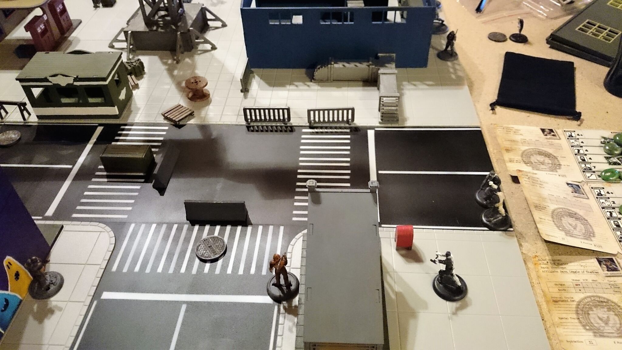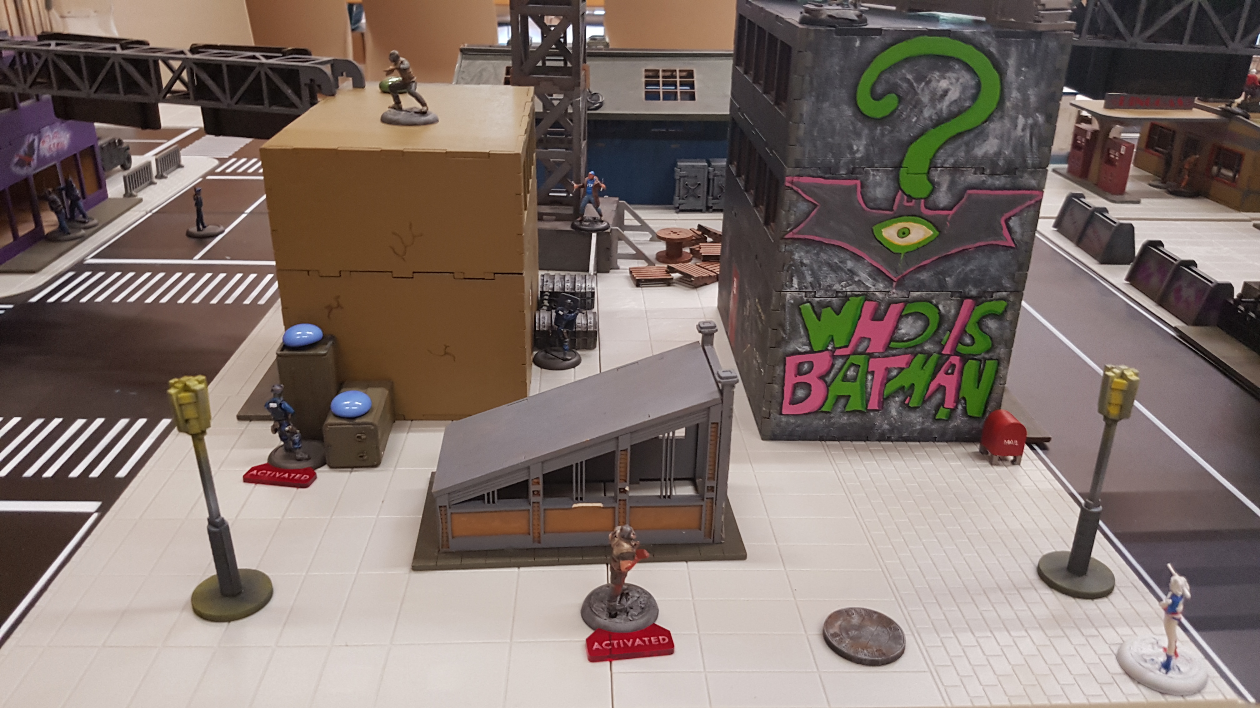 Das Spielfeld: Die Bösen betreten das Feld: Banes Handlanger befreien einen Gefangenen aus dem S.W.A.T. Auto: Und treten mit der einen oder anderen zwielichtigen Person in Kontakt: Verteilt rücken die Angreifer vor: Diggle konnte sich eines Angreifers erfolgreich erwehren, doch der Nächste kommt schon angerannt: Der Serverraum steht kurz vor der Erstürmung... als Batman auf den Plan tritt: Jedoch kann nicht verhindert werden, dass Katana, welche den Serverraum beschützt, überwältigt wird: A.R.G.U.S. bleibt nichts anderes übrig, als die Server zum Schutz herunterzufahren.