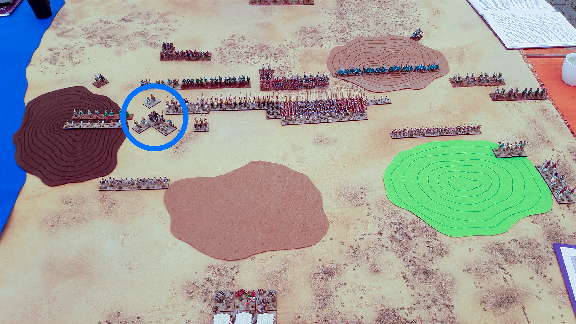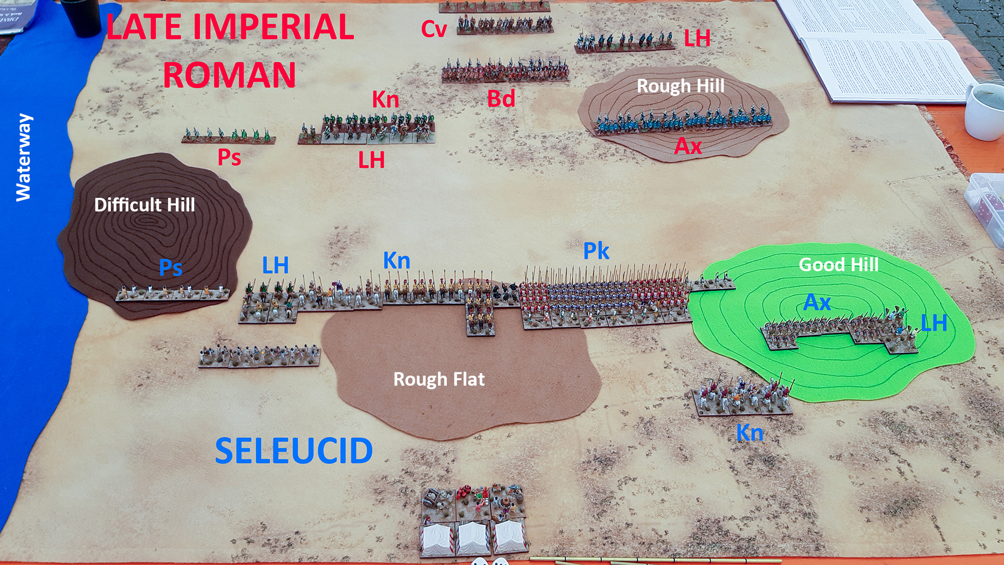 Obwohl Guido Angreifer war, musste er seine Armee zuerst aufstellen. Vor meiner Seite aus gesehen hat er links ein berittenes Kommando aus leichter Reiterei und Rittern platziert. Im Zentrum standen, leicht nach hinten versetzt, seine Legionäre sowie Kavallerie in der Reserveposition. Das rechte Kommando bestand aus Auxiliartruppen, die auf dem Hügel Stellung bezogen haben, und einer Abteilung leichter Reiterei hinter dem Hügel. Ich selbst habe auf dem linken Flügel ein Kommando platziert, das vor allem Ritter und leichte Reiterei enthielt, im Zentrum stand meine Phalanx (PkO und PkS) und auf dem rechten Flügel standen, etwas nach hinten versetzt, meine Thorakitai (AxS) auf dem Hügel mit ein wenig leichter Reiterei daneben, sowie einige Ritter hinter dem Hügel.