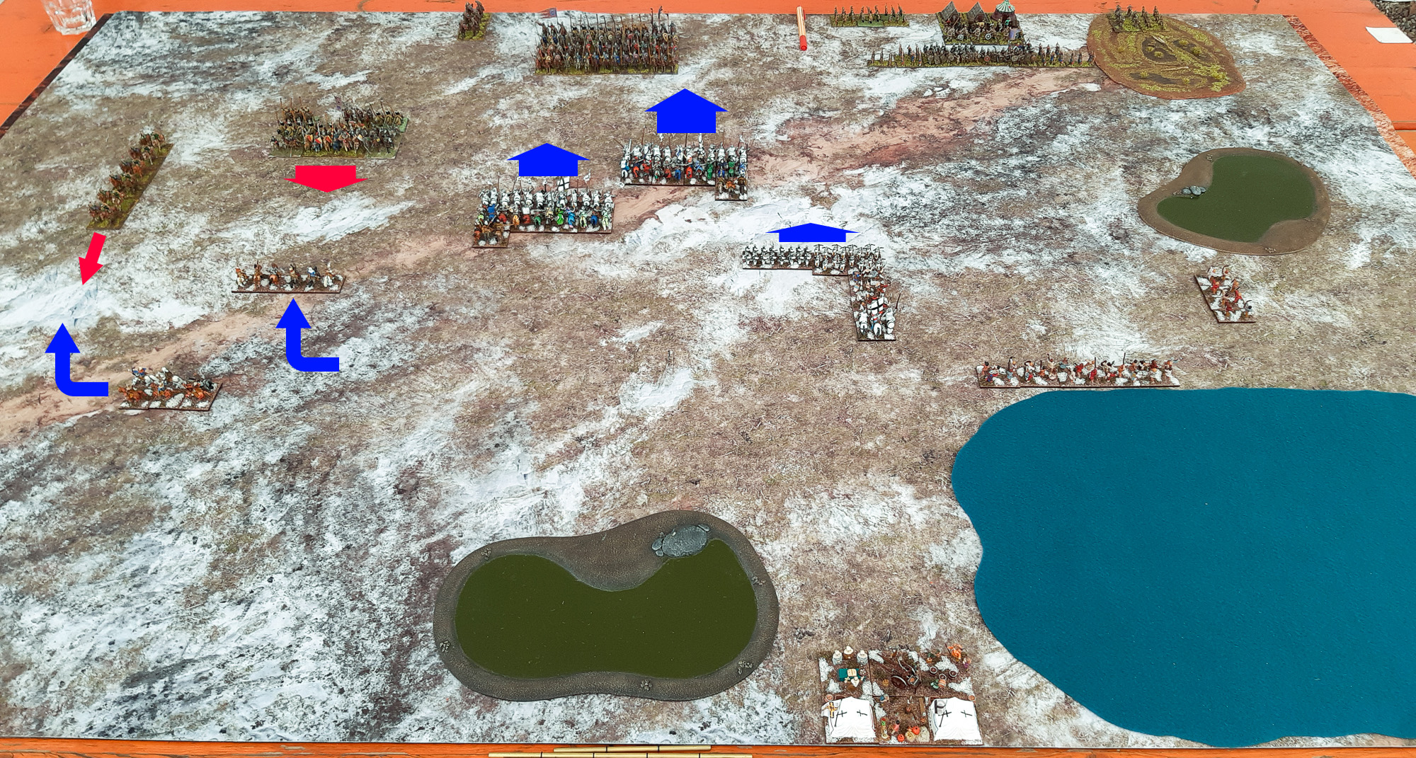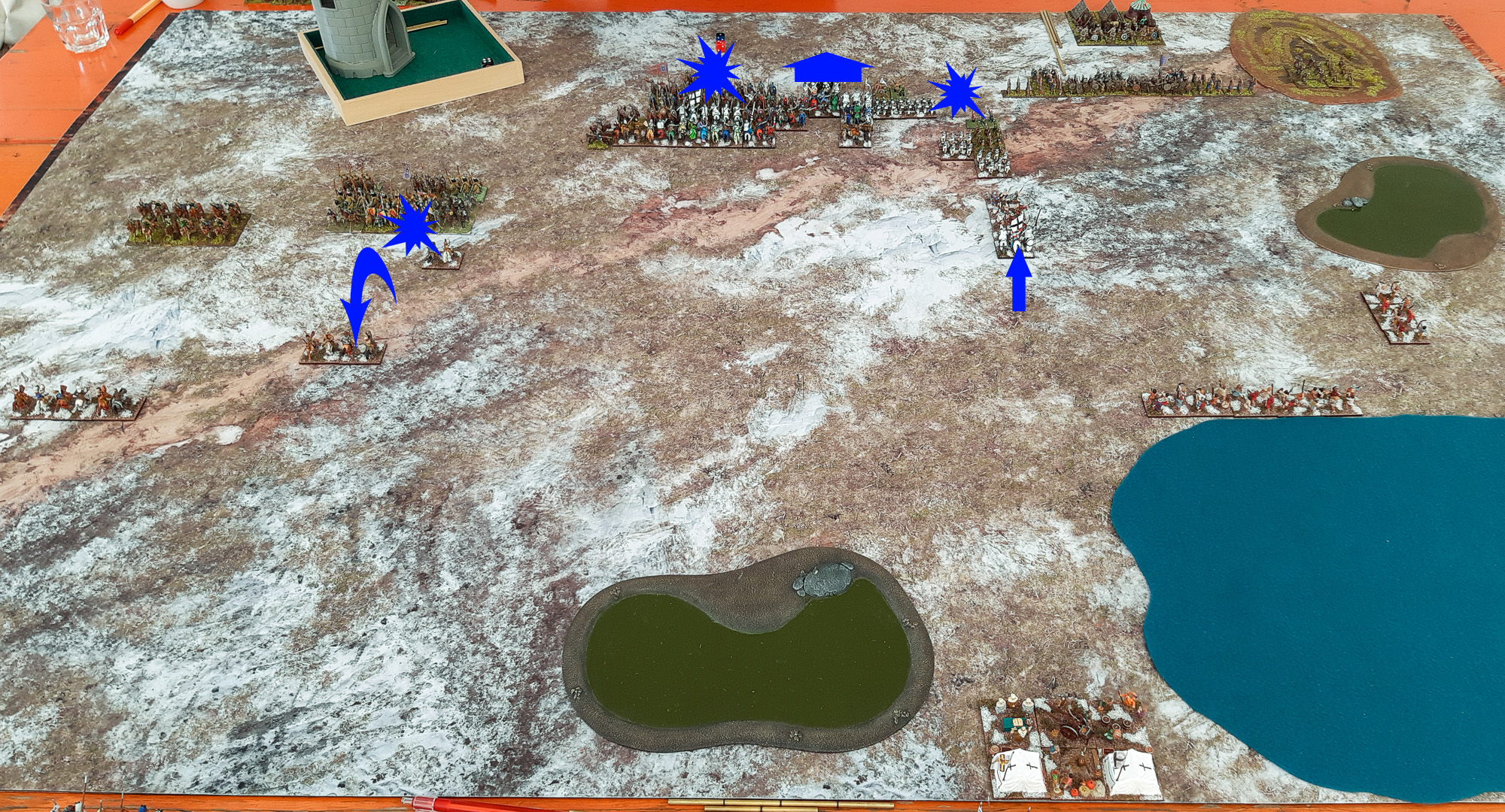 Am vergangenen Sonntag sind Franks "Early Russians" und meine "Teutonic Orders" (Deutscher Orden) in den eisigen Ebenen Russlands auf einer schönen, dazu passenden Wintermatte in einer 400AP-Partie aufeinandergetroffen :aufsmaul Um sogleich mit einer Ernüchterung zu beginnen und das Ergebnis vorwegzunehmen: Wir müssten aus Zeitgründen ca. ein bis zwei Runden vor dem vermutlichen Ende der Schlacht aufhören und haben uns auf ein Unentschieden geeinigt - bzw. Frank hat gemeint, ich hätte wohl gewonnen, während ich annehme, Frank hätte gewonnen... Also insofern ein faires und gerechtes Ende für ein ungemein spannendes und streckenweise nervenaufreibendes Gefecht :D