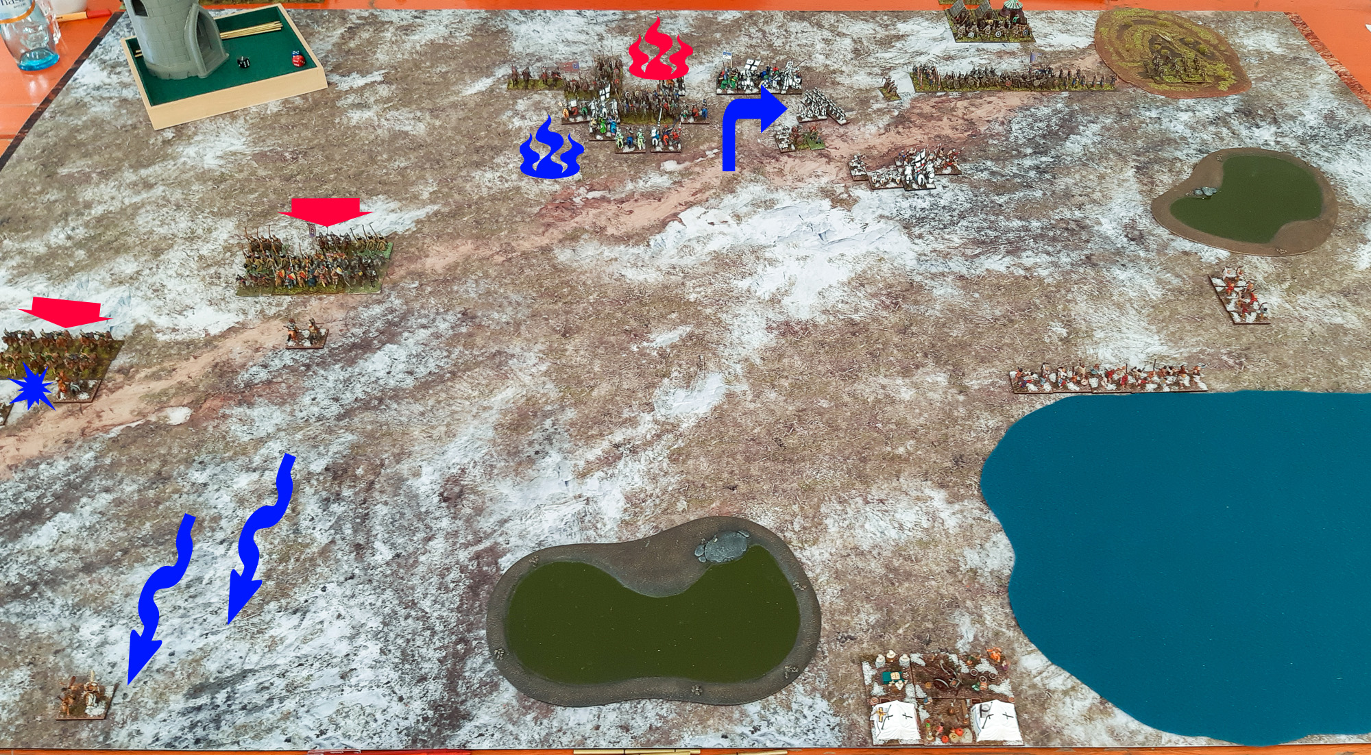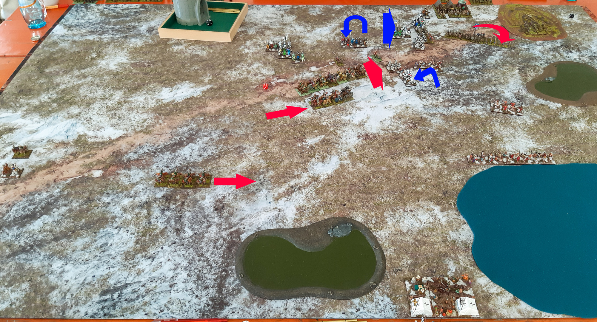 Mein Deutscher Orden bestand aus drei Kommandos, wobei zwei davon identisch waren und hauptsächlich aus Kn (S) in der ersten Reihe bestanden, mit Kn (O) dahinter (ich habe in dieser Schlacht mal nicht mit der doppelbasierten Variante gespielt, weil diese keinen Quickkill gegen die Massen an Cv, die den Russen in ihren Armeen zur Verfügung stehen, haben). Außerdem gab es in den beiden Kommandos noch je drei LH (O) und eine Cv (I), die flexibel als Flankenschutz, zum Ausflankieren oder zum Lückenfüllen eingesetzt werden können. Mein drittes Kommando (mit dem C-in-C) bestand ausschließlich aus Infanterie, und zwar einem Mix aus Sp, Bw, Ax, Ps und Hd zu je ungefähr gleichen Teilen. Dieses Kommando habe ich an dem großen Sumpf verankert, mehr oder weniger dem russischen Infanteriekommando gegenüber - seine Aufgabe sollte es sein, die russische Infanterie daran zu hindern, maßgeblich in der Schlacht einzugreifen. Denn die eigentliche Hauptaufgabe war den beiden berittenen Kommandos vorbehalten, die geradeaus stürmen und die Cv des zentralen russischen Kommandos zerschmettern sollte. Demgemäß hatte ich die PIP-Würfel folgendermaßen zugeordnet: Der höchste und mittlere PIP werden gemittelt und dem ersten und zweiten Kommando zugeteilt, der niedrigste PIP wird dem dritten Kommando zugeteilt.