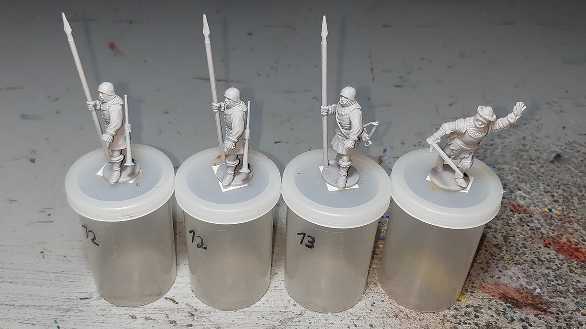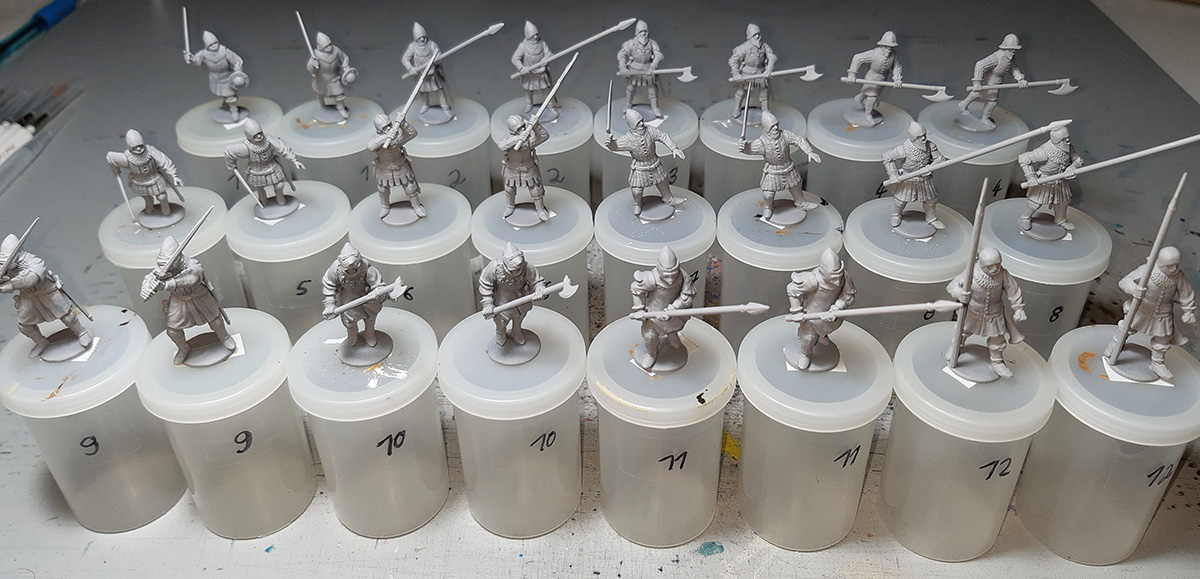 Mit der Heavy Infantry stehen die nächsten Figuren zum Bemalen bereit, die Grundierung ist bereits erfolgt. Da ich davon zwei Einheiten haben möchte, sind es diesmal 24 Figuren. Wie auch bei den Crossbowmen werden sie strikt nach einem zuvor ausgearbeiteten Farbschema bemalt :ugeek: