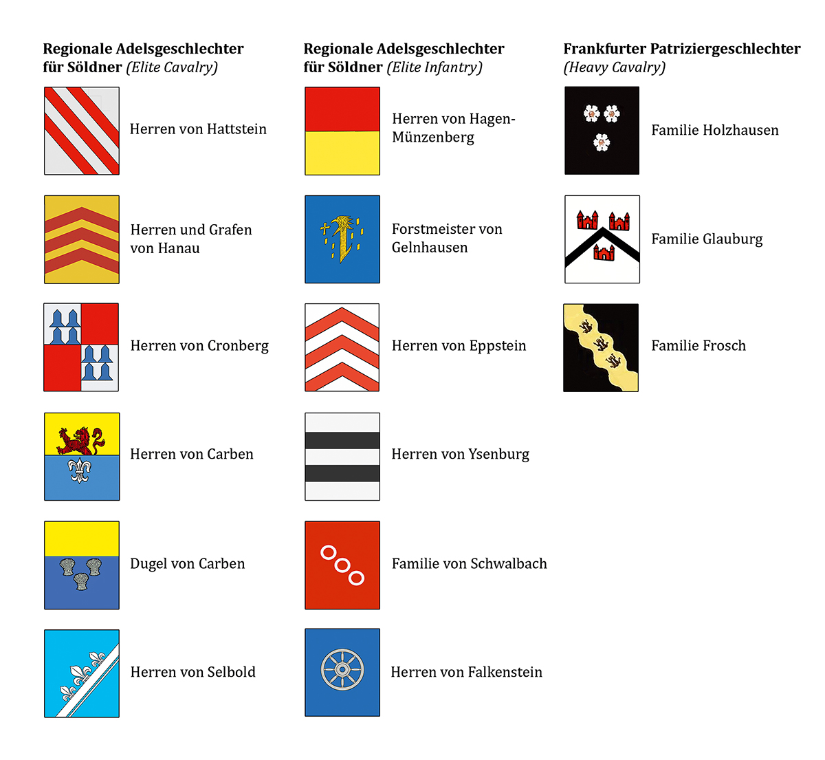 Bei den Frankfurter Patriziern, welche die Heavy Cavalry stellen, werden nur drei Reiter mit Schilden ausgestattet, weshalb ich nur drei konkrete Geschlechter darstellen werde; die anderen sind quasi generische Familien. Die Farbe der Kleidung ist bei den Patriziern ausnahmslos in roter Farbe gehalten (wie auf dem Gemälde von der Schlacht bei Eschborn), d.h. die familiäre Herkunft wird ausschließlich durch die mitgeführten Schilde, soweit vorhanden, gekennzeichnet, da nach meiner Theorie der Korpsgeist der Zugehörigkeit zum Patriziat gegenüber der dynastischen Herkunft überwiegt.