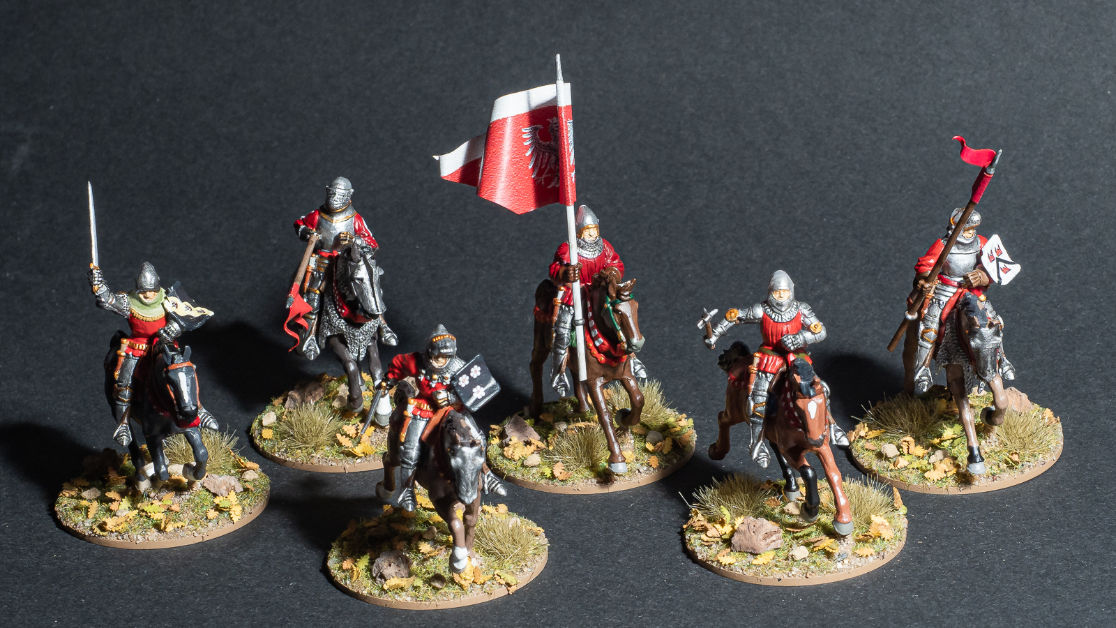 Der eine Teil der Söldner wird als Elite Cavalry aufgestellt. Diese führen kleine eckige Schilde mit sich, auf denen man die Wappen gut darstellen kann. Die Farbe der Kleidung richtet sich vornehmlich nach der Farbe der Wappen. Für den anderen Teil der Söldner, die als Elite Infantry aufgestellt werden, wird das ganze schwieriger, da sie keine Schilde haben. Hier müssen die Waffenröcke selbst entsprechend mit den Symbolen verziert werden (ob ich das aufmale oder ausdrucke und beklebe, werde ich von Fall zu Fall entscheiden).